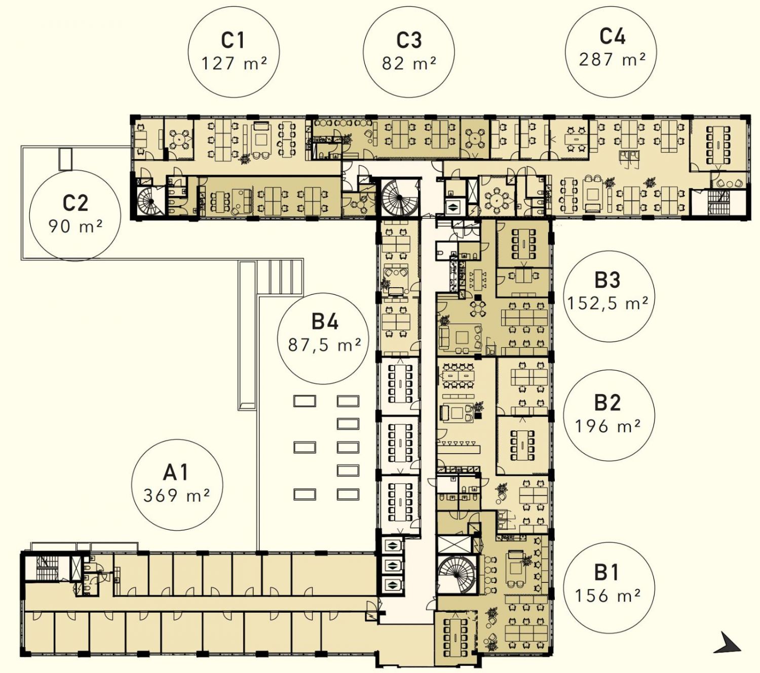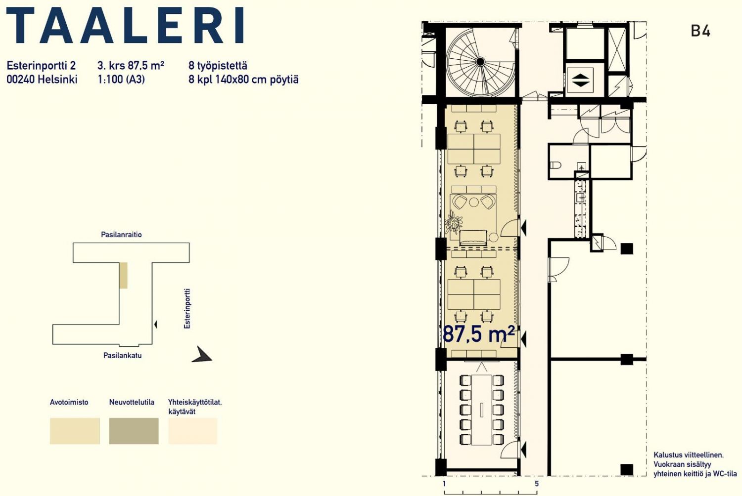 Vuokrataan Helsingin Länsi-Pasilasta kolmannen kerroksen 87,5 m² kalustamaton pientoimistotila. Tilatunnus B4. pohjakuvassa. Pientoimistojen yhteydessä on kolme yhteiskäyttöistä neuvotteluhuonetta ja niitä palvelevat keittiö sekä WC-tilat.