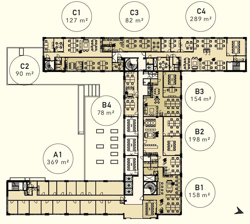 Vuokrataan Helsingin Länsi-Pasilasta kolmannen kerroksen 154 m² kalustamaton pientoimistotila. Tilatunnus B3. pohjakuvassa. Pientoimistojen yhteydessä on kolme yhteiskäyttöistä neuvotteluhuonetta ja niitä palvelevat keittiö sekä WC-tilat.