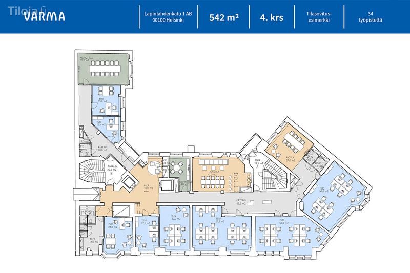 Vuokrattavana 541 m² jugendtyylinen toimistotila Helsingin Kampissa, Lapinlahdenkatu 1:ssä. Tila kattaa kokonaisen kerroksen ja tarjoaa monipuoliset mahdollisuudet erikokoisten tiimien sijoittamiseen. Huonejako on joustava, ja tilassa on avara taukokeittiö, omat wc-tilat sekä hissiaula.