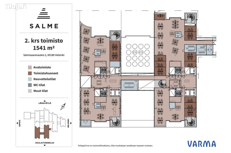 Vuokrattavana 1540 m² toimistotila Salmisaarenaukio 2:ssa, Helsingin Salmisaaressa. Tila sijaitsee kiinteistön toisessa kerroksessa ja tarjoaa muokattavat, modernit työtilat, jotka voidaan räätälöidä vuokralaisen tarpeiden mukaan.