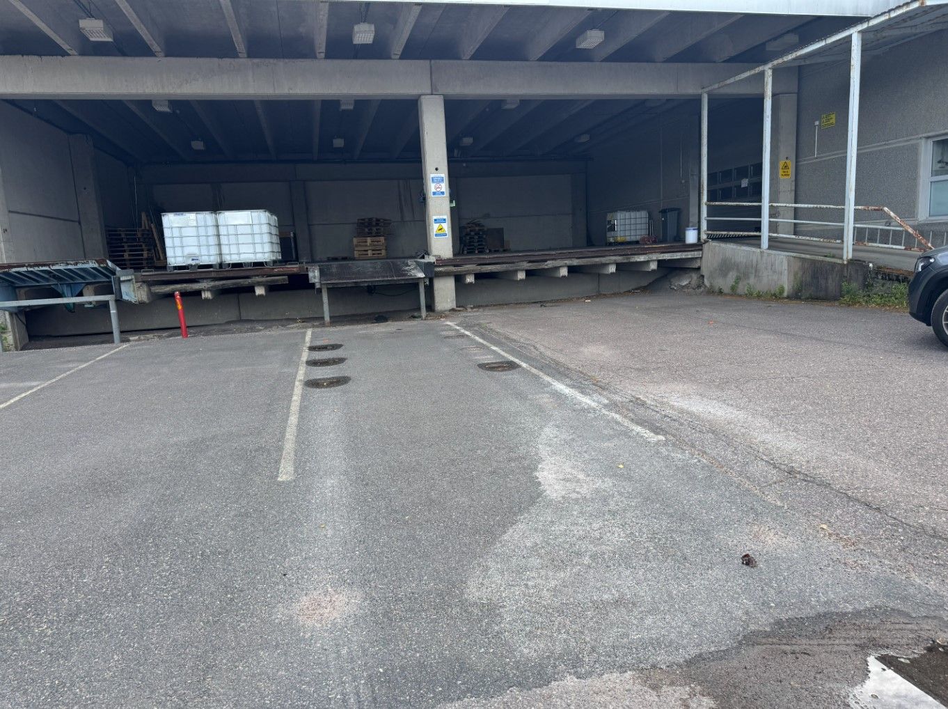Lastauslaituri tilassa. Pihalla parkkipaikkoja.