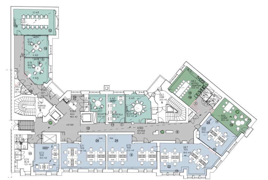 Tämä 545m² toimistotila sijaitsee kiinteistön 6. kerroksessa. Toimistossa on erikokoisia työ- ja neuvotteluhuoneita, tiimitiloja sekä omat keittiö- ja wc-tilat. Talon monipuoliset palvelut ovat yrityksesi tukena. Kuvat ovat yleiskuvia kiinteistön tiloista.