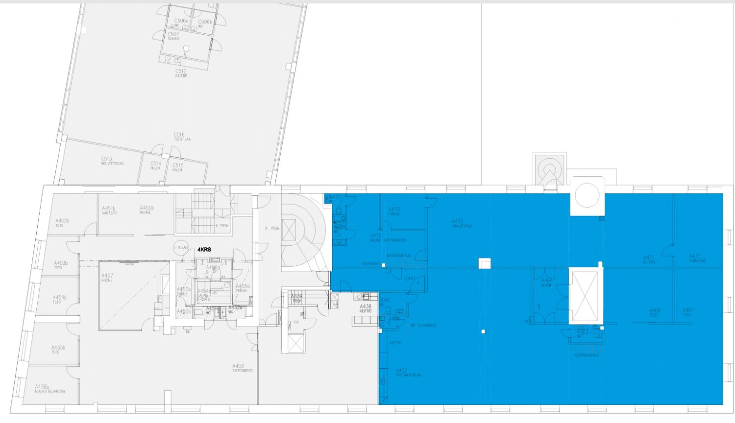 Vuokrattavana 4. kerroksen valoisaa ja korkeaa toimistotilaa. Tilassa on avotila, neuvotteluhuoneet, oma keittiö ja wc:t.