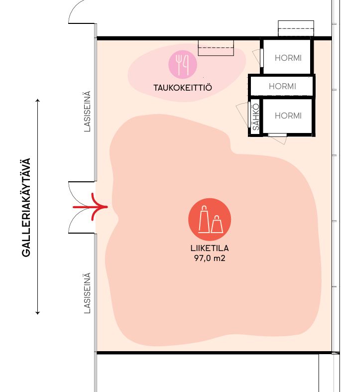 Toisen kerroksen liiketila sijaitsee galleriakäytävän varrella, tarjoten erinomaisen näkyvyyden korttelin sisäpihalle. Tila on muokattavissa tulevan käyttäjän tarpeiden mukaan, joten siitä voidaan räätälöidä juuri sinun liiketoiminnallesi täydellinen ratkaisu.