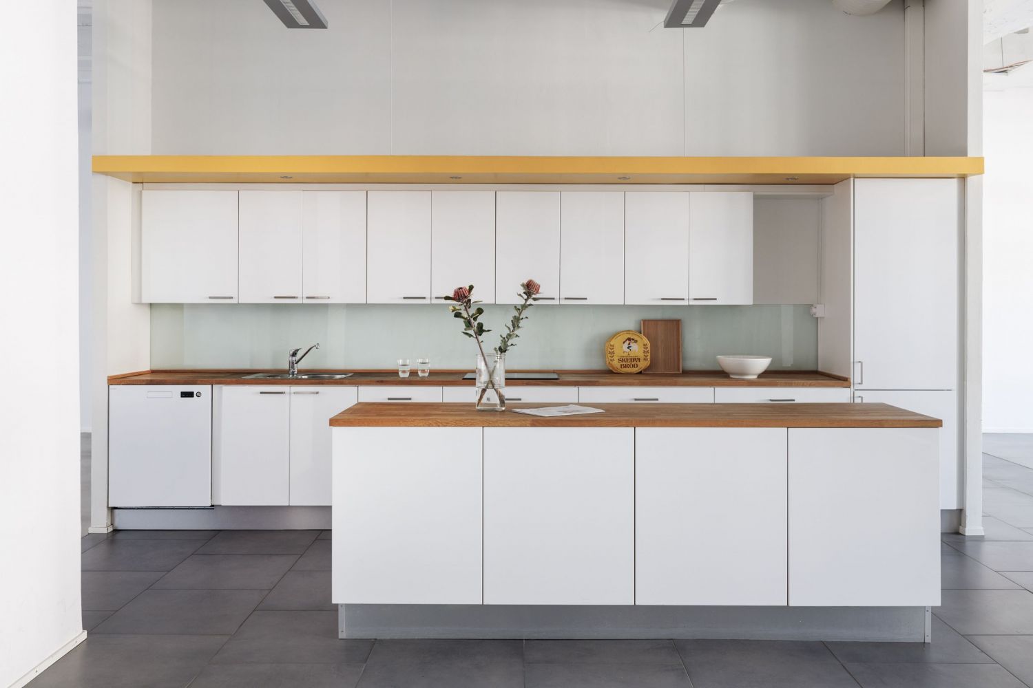 Industrial-tyylinen tila, korkea huonekorkeus ja valoisa ympäristö