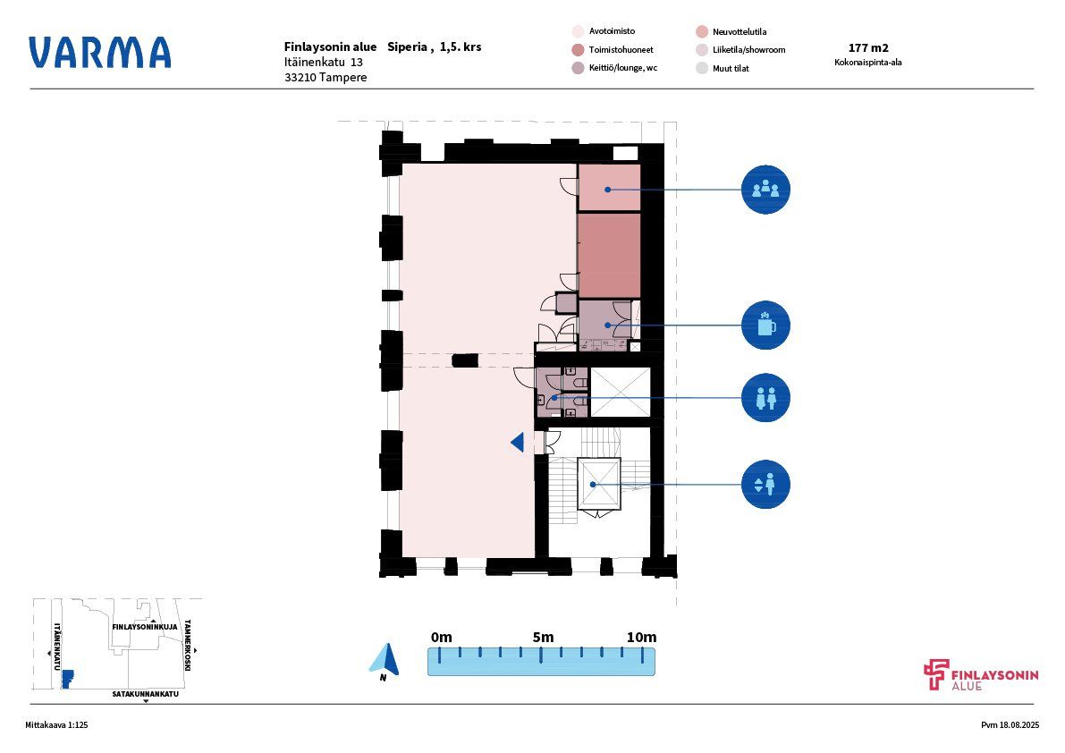 Perinteikäs Finlaysonin alue on vireä liike-elämän, vapaa-ajan ja kulttuuritapahtumien keskus, jossa toimivissa yli 100 yrityksessä työskentelee ja asioi päivittäin tuhansia ihmisiä. Alueen useat ravintolat ja kahvilat mahdollistavat maukkaat lounas- ja kahvihetket. Finlaysonin alueen vanhat tehdasrakennukset tarjoavat yrityksellesi uniikin toimintaympäristön Tammerkosken maisemissa. Finlaysonin alue on helposti saavutettavissa omalla autolla, julkisin kulkuvälinein ja kevyellä liikenteellä. Keskustori ja rautatieasema ovat kävelymatkan etäisyydellä. Kompakti toimistotila Siperia rakennuksen kulmassa, josta näkymät Keskustorille ja Itäiselle kadulle.