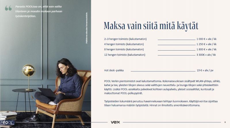POOL Verk tarjoaa joustavia ja vastuullisia tiloja tulevaisuuden työelämään. Tämä 20 m² pientoimisto soveltuu monipuolisesti: päätoimitilaksi, satelliittitoimistoksi, projektityöskentelyyn tai innovaatiotilaksi. Tilat sopivat sekä yksin että yhdessä työskentelyyn, ja ne voidaan vuokrata omaksi tilaksi tai osaksi POOLin kokonaisuutta joustavin sopimusehdoin.