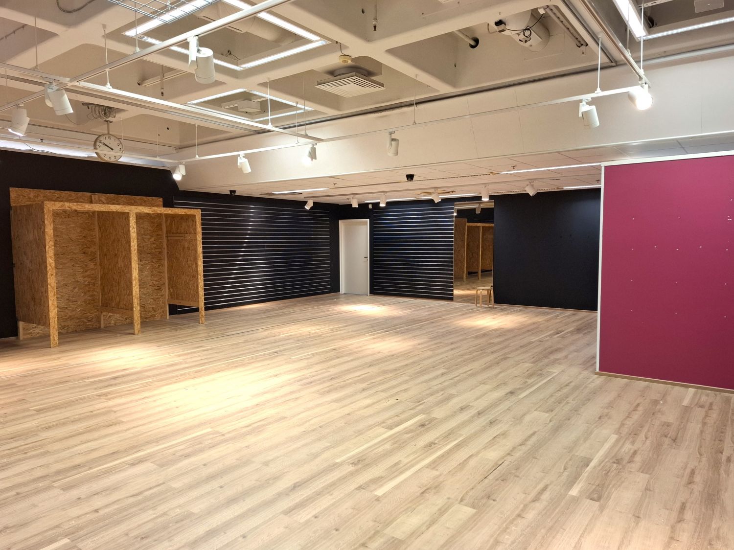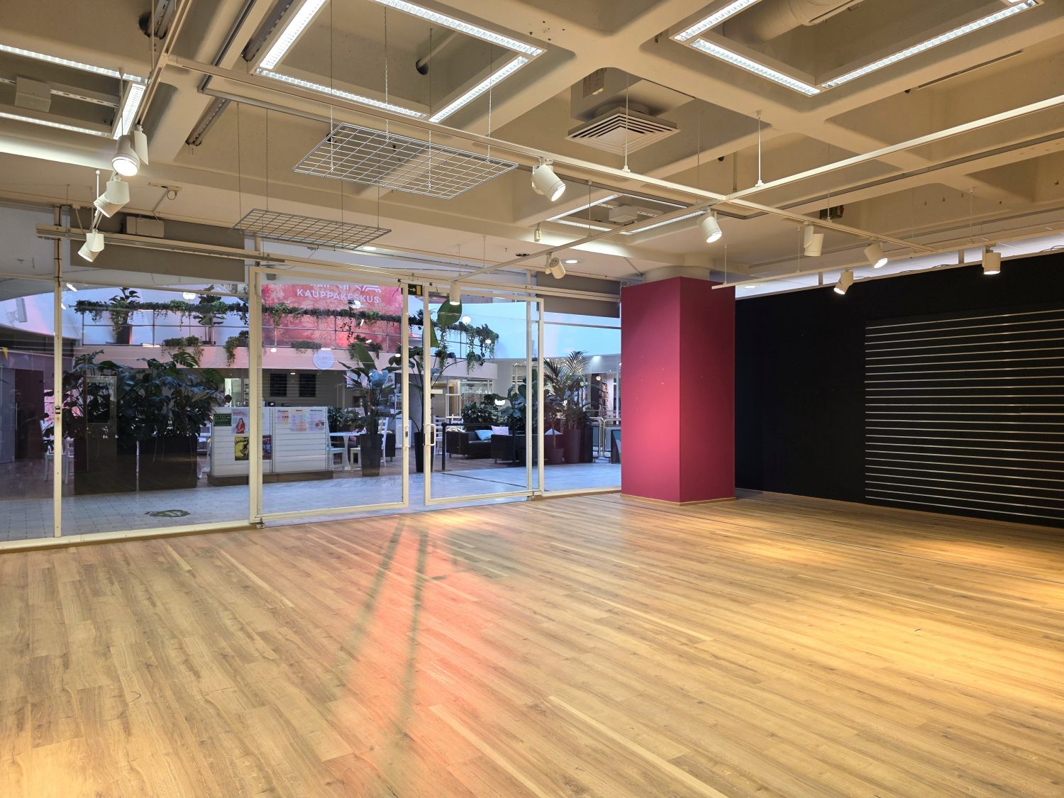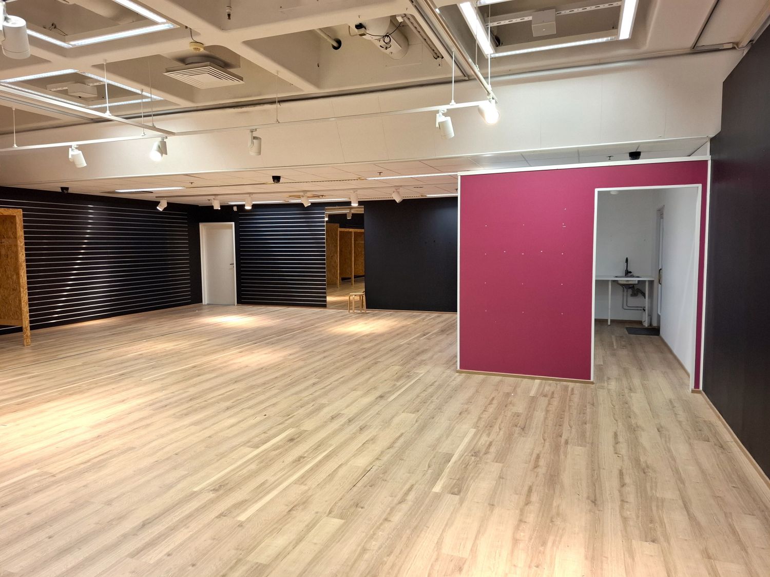 Tilassa on moderni valaistus, laadukas lattiamateriaali ja valmiiksi rakennettuja sovitus-/varastotiloja.