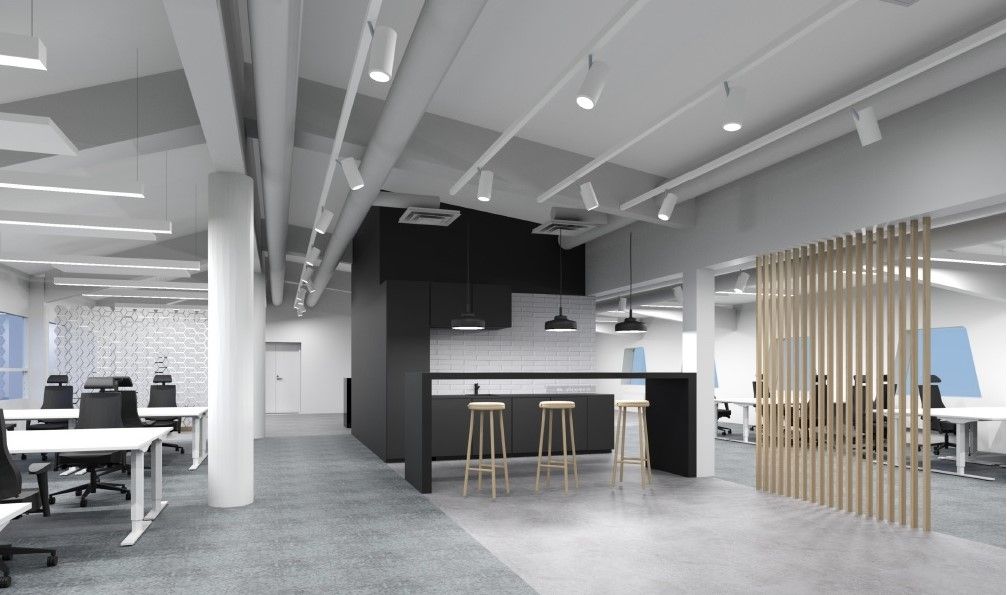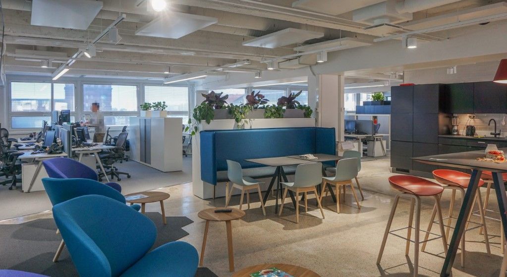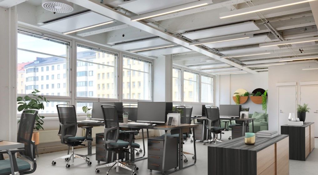 Viidennen kerroksen siisti ja valoisa monitilatoimisto. Havainnekuvat talon muista toimistoista. Tilasta upeat maisemat LEipätehtaan suuntaan.