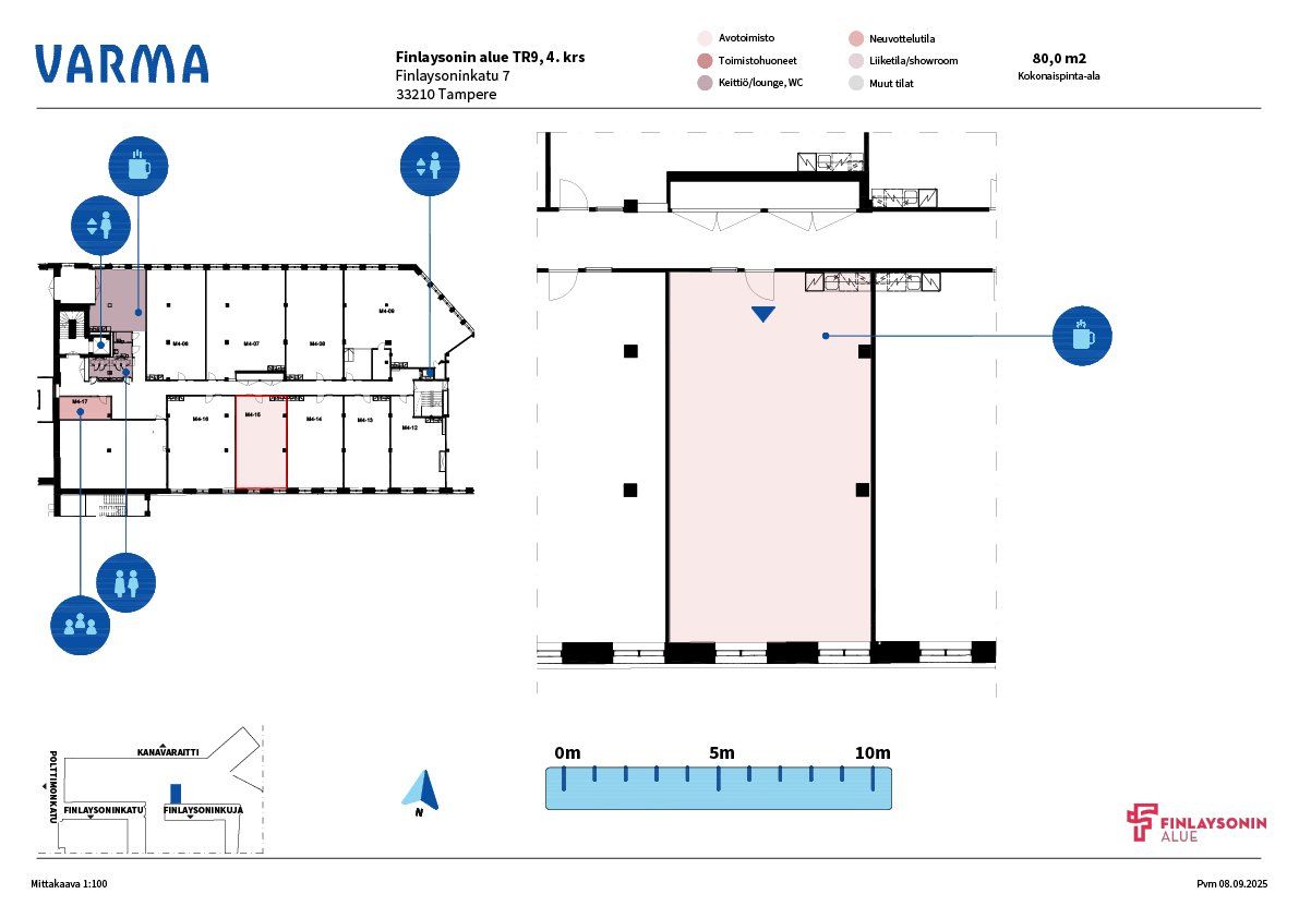 Perinteikäs Finlaysonin alue on vireä liike-elämän, vapaa-ajan ja kulttuuritapahtumien keskus, jossa toimivissa yli 100 yrityksessä työskentelee ja asioi päivittäin tuhansia ihmisiä. Alueen useat ravintolat ja kahvilat mahdollistavat maukkaat lounas- ja kahvihetket. Finlaysonin alueen vanhat tehdasrakennukset tarjoavat yrityksellesi uniikin toimintaympäristön Tammerkosken maisemissa. Finlaysonin alue on helposti saavutettavissa omalla autolla, julkisin kulkuvälinein ja kevyellä liikenteellä. Keskustori ja rautatieasema ovat kävelymatkan etäisyydellä. Avotoimistotila, jossa myös oma minikeittiö.