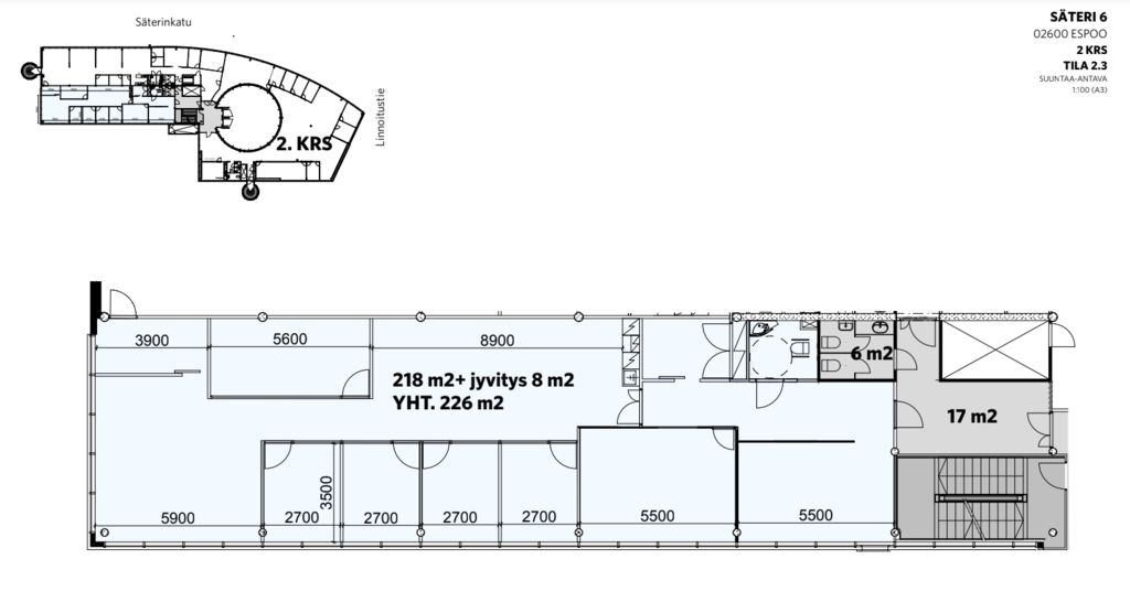 Tämä 226 m² tila sijaitsee kiinteistön 2. kerroksessa. Toimisto on pääosin huoneellinen, ja siihen kuuluu oma keittiö ja wc-tila.