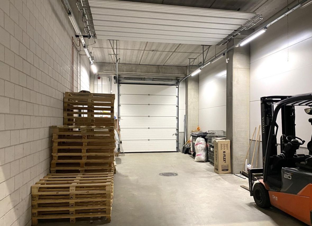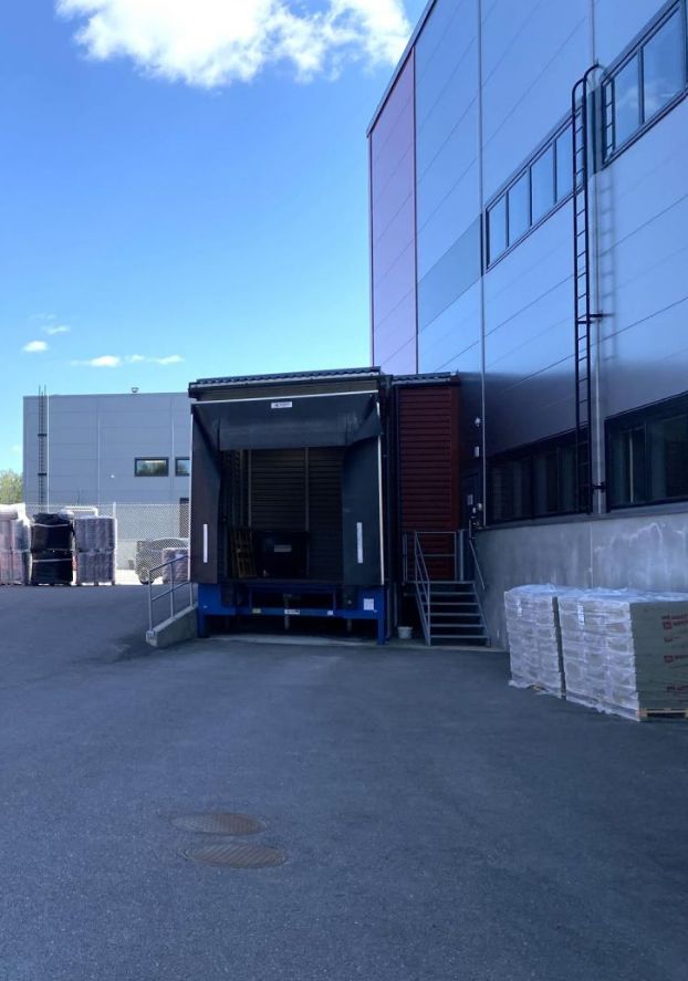 Varastohallin kulmassa on 3 x 3,5 m nosto-ovi, josta on sisäänajo. Kiinteistön katolla on aurinkopaneelit.