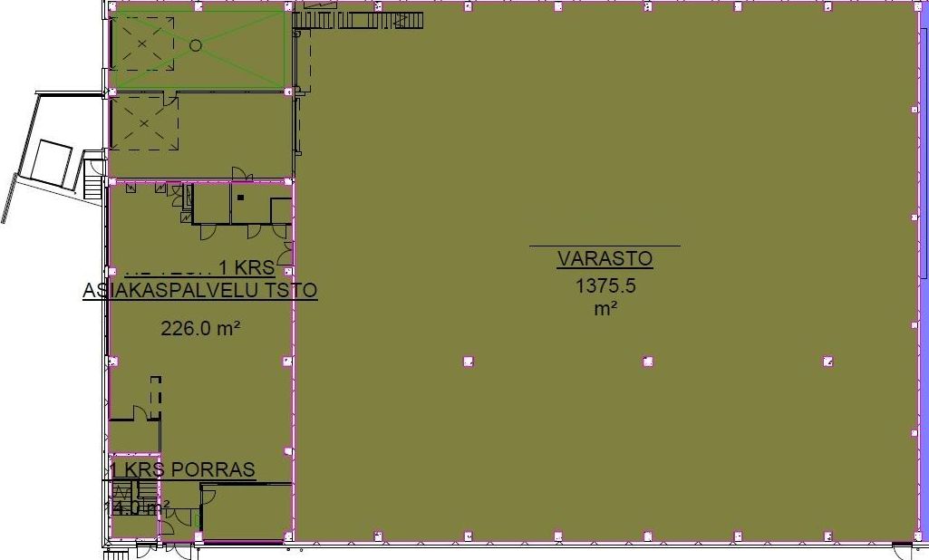 1. kerros varasto 1375 m², vapaa korkeus 10,7 m