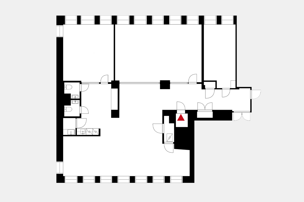 Tämä neljännen kerroksen tila koostuu avotilasta ja kolmesta työhuoneesta. Lisäksi oma keittiö ja omat wc-tilat.