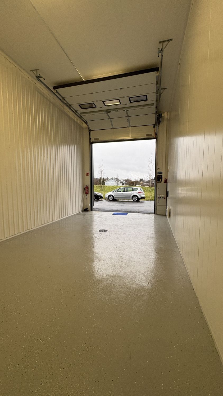 Moottoroitu nosto-ovi erillisellä käyntiovella. Autolla sisään ajettava tila. Tilamitat: 8,95 (Pituus) 4,50 (Leveys) 5,00 (Korkeus). Ovimitat: 3,45 (Leveys) 3,90 (Korkeus).