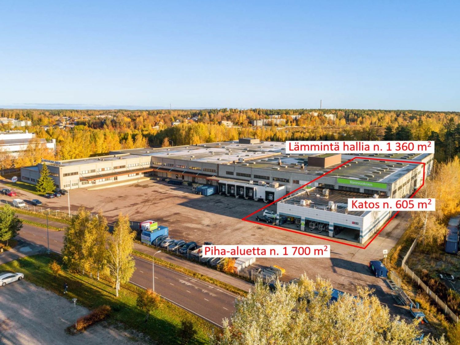 Vuokrattavana Espoon Kauklahdesta 2 141 m²:n varasto-/tuotantotila kokonaisuus. Tilat vapautuvat kesälle 2026 ja ne koostuvat n. 1 360 m² lämpimästä hallitilasta, sosiaali- ja wc-tiloista sekä n. 605 m² varastokatoksesta. Lisäksi toimitilaan kuuluu n. 1 700 m² piha-aluetta.