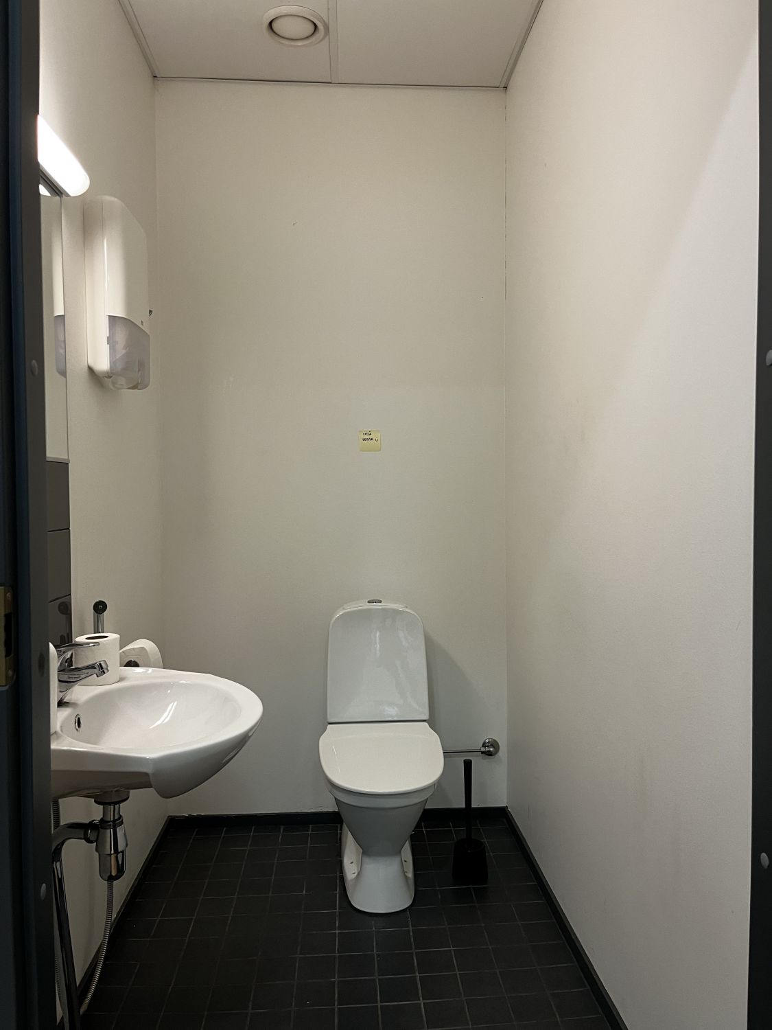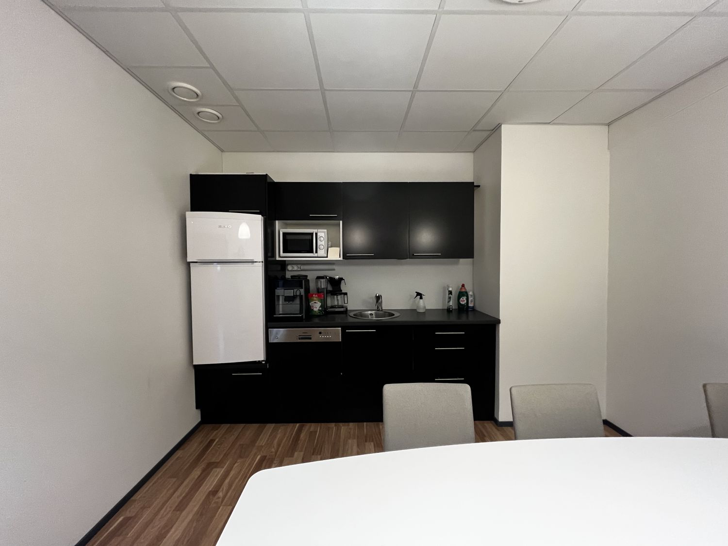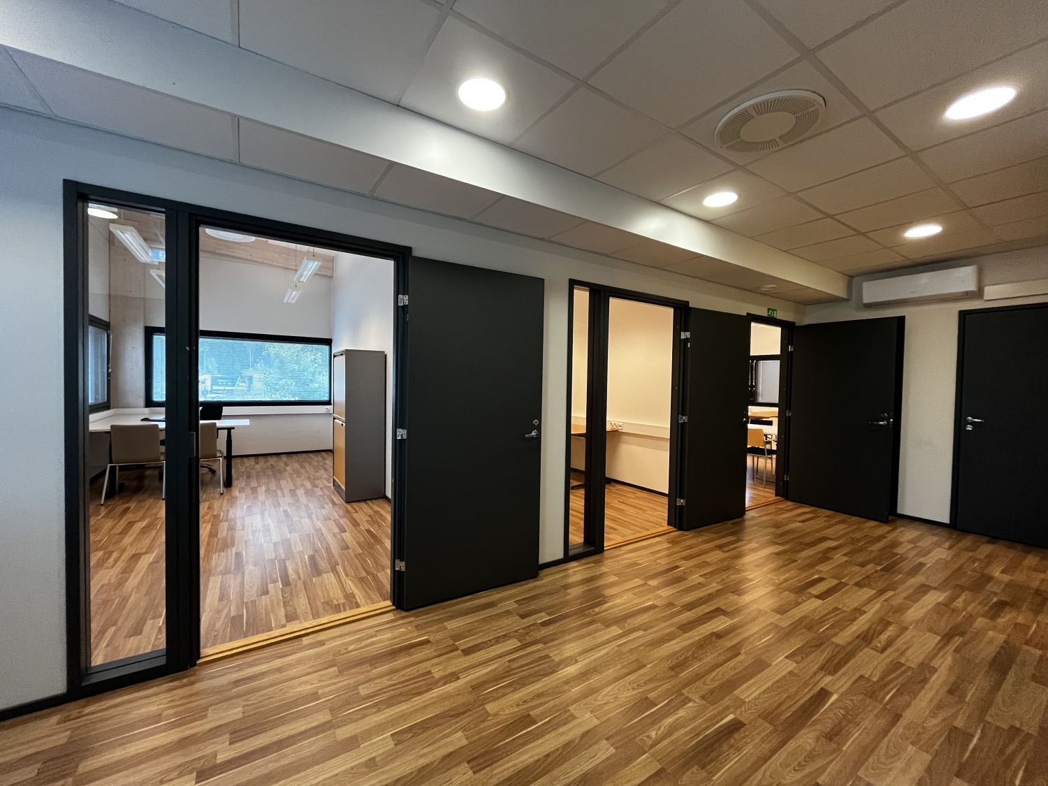 Toimistotilojen pohjaratkaisu on molemmissa kerroksissa identtinen: tilava taukotila siisteillä keittiökalusteilla, 1 wc per kerros. Lisäksi seinillä erotettuja eri kokoisia toimistohuoneita. Toimistotiloissa lisäksi viilennys. Alakerroksessa suurinta toimistohuonetta käytetty kevyenä varastona. Tähän tilaan johtaa ulkopuolelta käyntiovi.