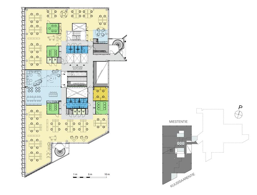 Tämä 902 m² monitilatoimisto kattaa kiinteistön 3. kerroksen. Tilan voi vuokrata yhtenä kokonaisuutena, tai se voidaan jakaa kahdelle käyttäjälle joko 664m²/238m², tai 535m²/367m² kokoisiin osiin. Tiloihin on mahdollista saada työhuoneita, avotilaa, neuvottelutiloja, hiljaisen työskentelyn tiloja sekä kohtaamis- ja taukotiloja tarpeiden mukaan. Kuvat ovat yleiskuvia kiinteistön tiloista.
