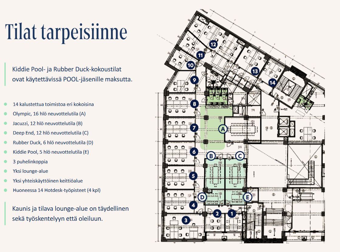 Valmiiksi kalustettu ja sisustettu studio / toimisto, sisältäen kaikki sujuvaan työntekoon liittyvät palvelut. POOLin studiovuokraan sisältyvät valmiit verkkoyhteydet, kopiointi- ja tulostuspalvelut ja it-tuki. POOLissa on myös oma aulapalvelu ja tyylikkäät taukotilat pienpaahtimon kahvi- tai teetarjoiluineen.