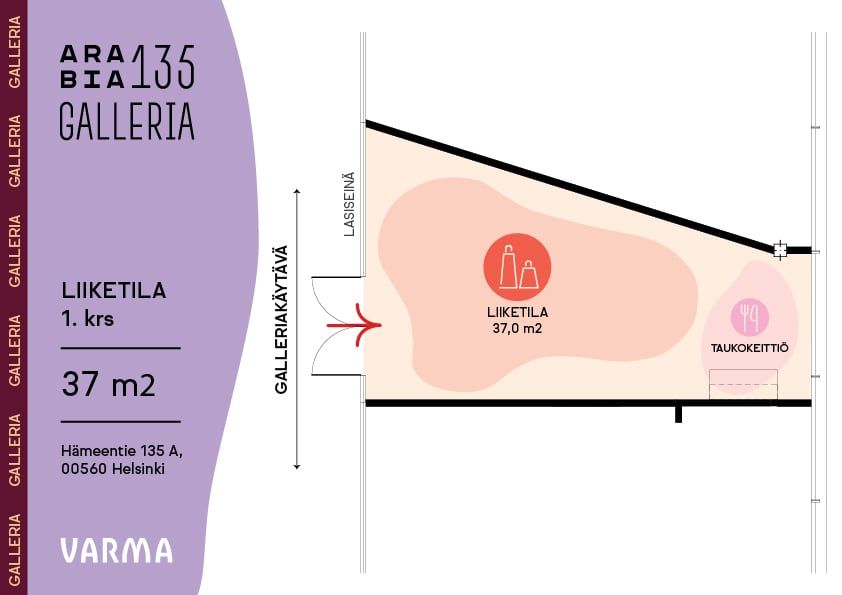 Arabia 135 -tehdaskortteli Helsingin Toukolassa tunnetaan luovien ideoiden ja toteutusten kohtauspaikkana ja osana suomalaisen designin historiaa. Entinen keramiikkatehdas on jo vuosia toiminut modernina design-liikkeiden, pääkonttoreiden ja oppilaitosten yhteisönä, mutta nyt käynnissä on huikea uudelleensyntyminen. Eri asteista ja tyylistä vuokrattavaa tilaa korttelissa on kaikenlaisille yrityksille. Lasiseinäinen liiketila galleriakäytävällä. Pieni taukokeittiö. Ei sovellu ravintolakäyttöön.
