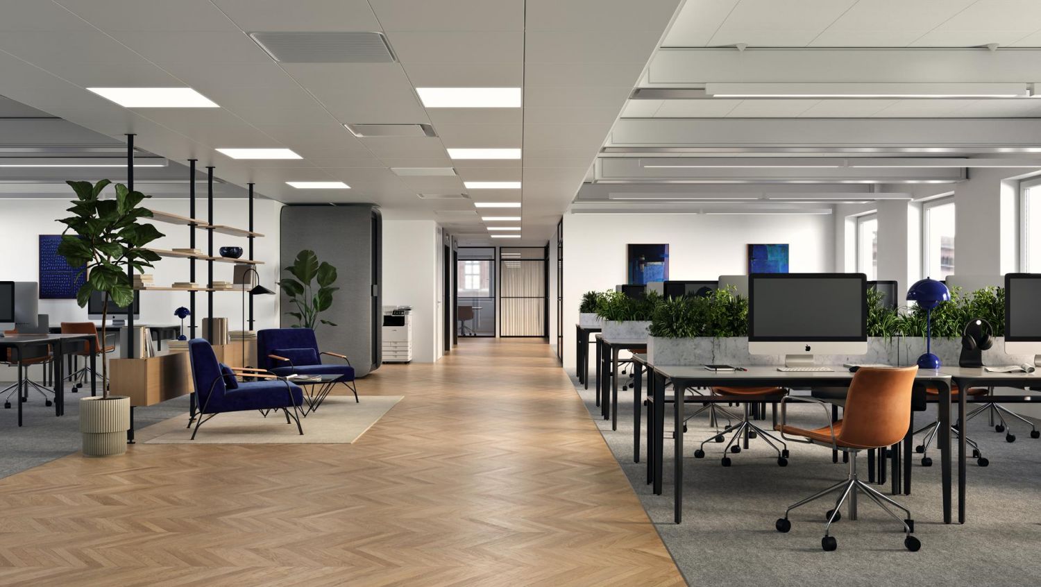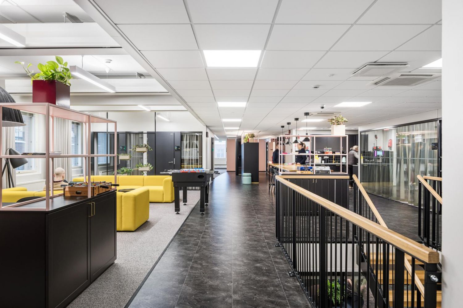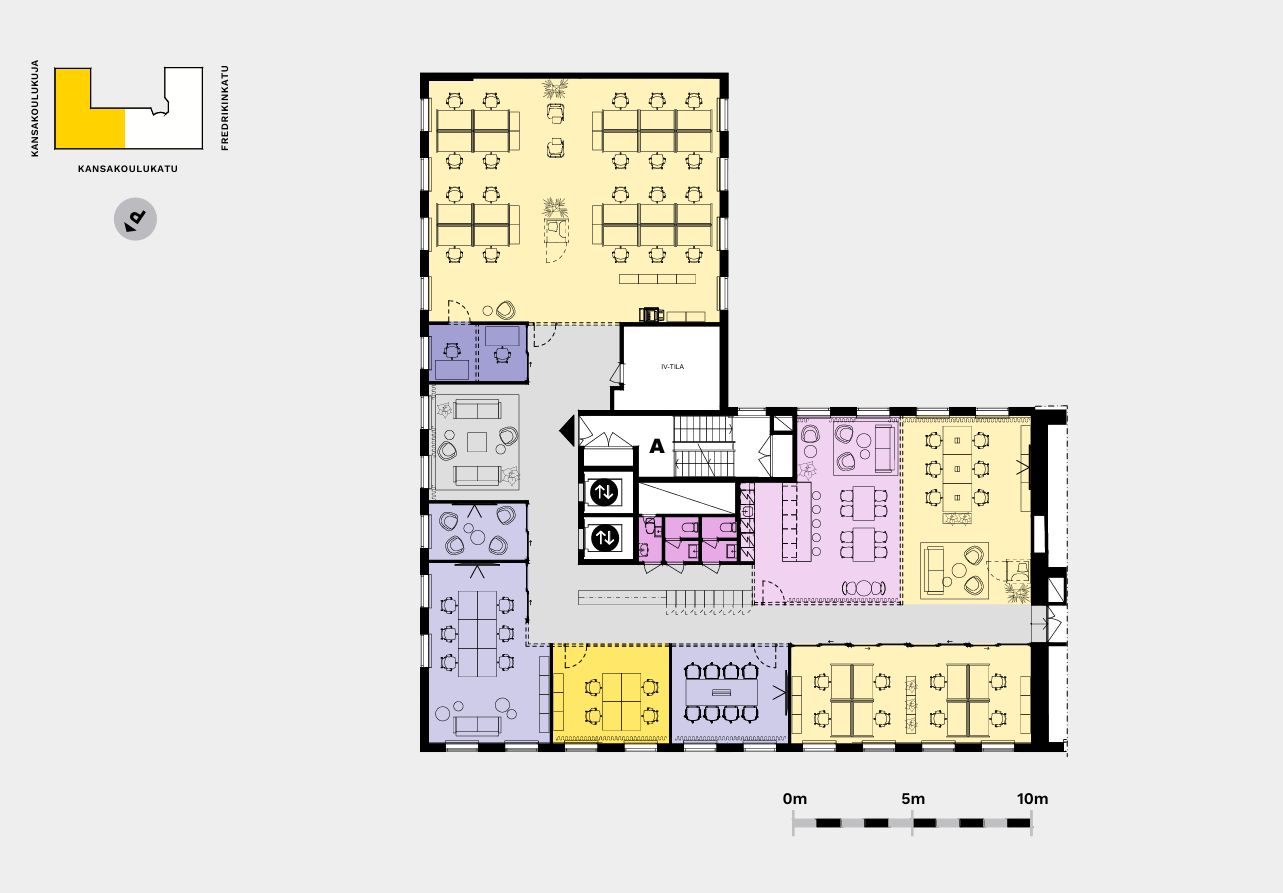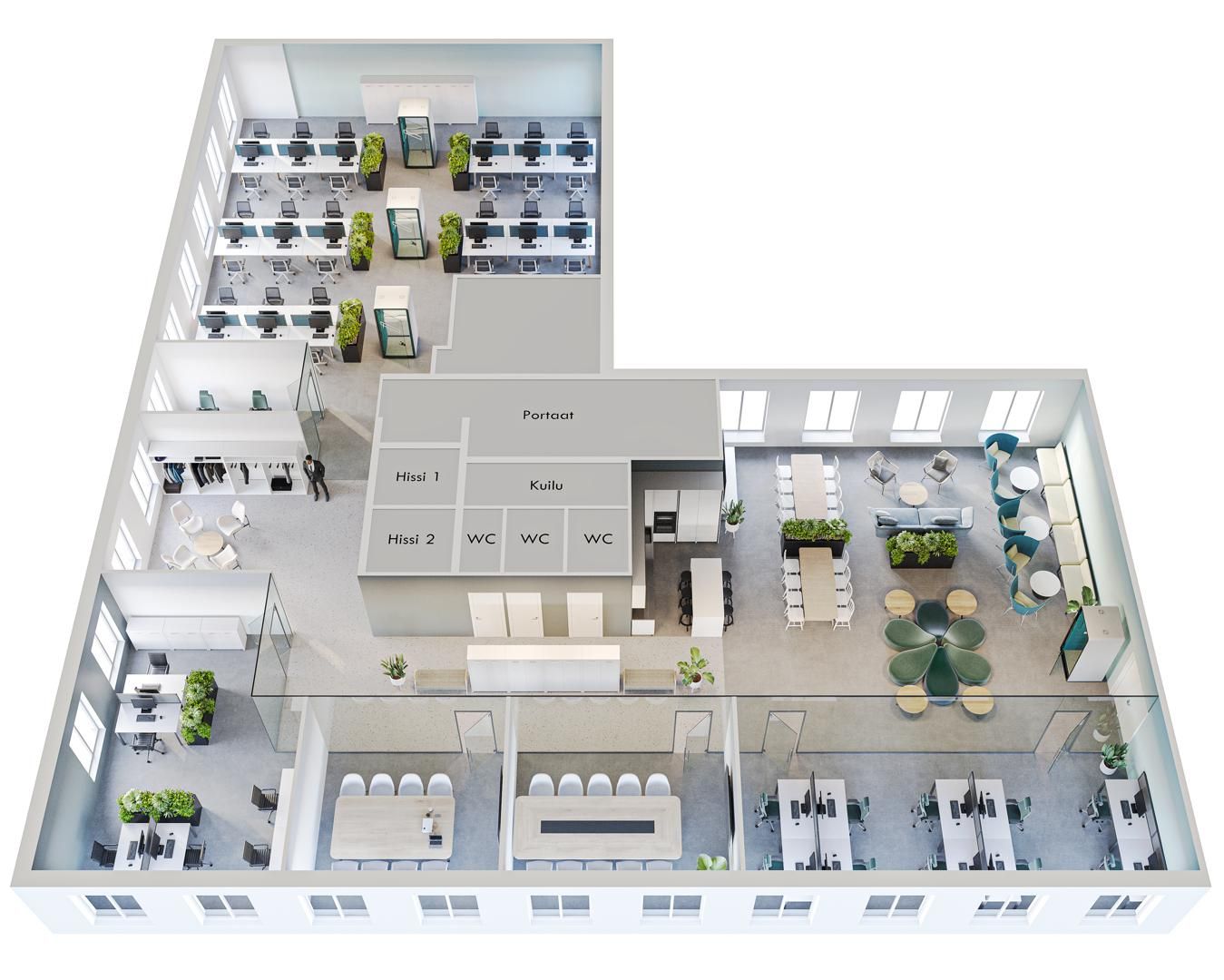 465 neliömetriä tilaa viidennessä kerroksessa antaa loistavat puitteet yhdistää avotyöalueita, tiimityötiloja, vetäytymistiloja ja neuvotteluhuoneita. Tilaan voidaan luoda myös upea loungekahvila-alue, jossa henkilöstö voi kokoontua, rentoutua ja viettää aikaa yhdessä. Yksi selkeä sisäänkäynti tekee kulkemisesta sujuvaa, ja näkymät avautuvat useaan suuntaan – puistomainen Annantalo, Kansakoulukadun arkkitehtuuri ja rauhallinen sisäpiha luovat inspiroivan ympäristön työskentelylle.