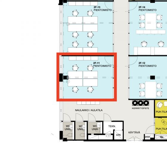 Kiinteistön 2. kerroksessa on pientoimistoalue, josta on mahdollista vuokrata toimistohuoneita kalustettuna tai ilman. Tilakokoja on saatavilla väliltä 25m2-105m2. Kerroksessa on yhteiskäyttöiset wc-, keittiö- ja neuvottelutilat.
