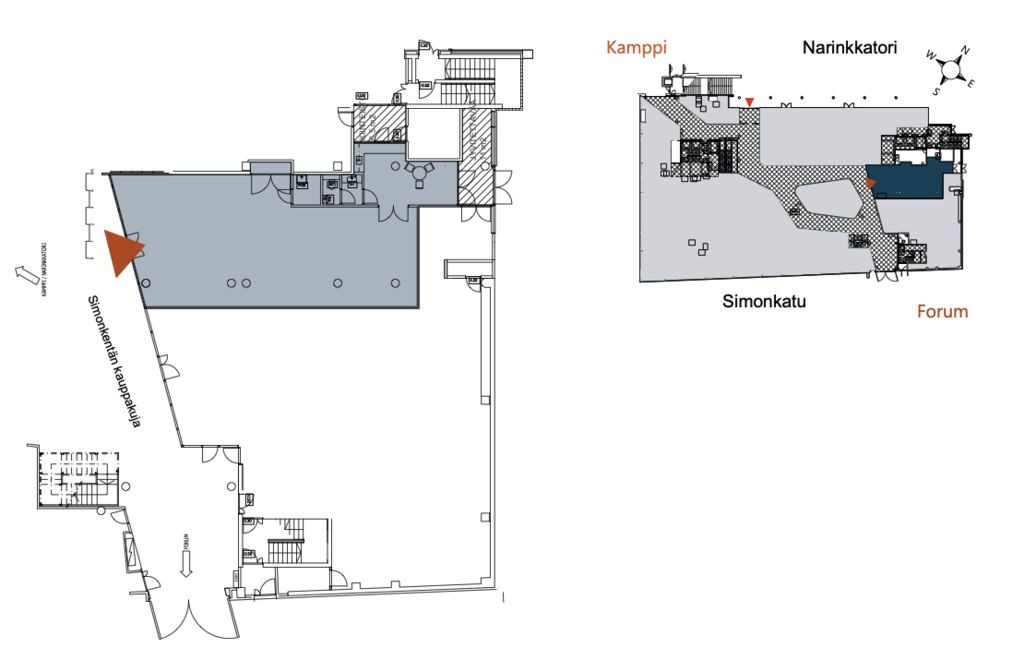 Tämä 152 m² liiketila sijaitsee Simonkentän vilkkaalla kauppakujalla. Kampin ja Forumin kauppakeskusten läheisyys lisäävät kohteen vetovoimaa. Tilassa voi toimia myös arvonlisäveroton toimija kuten lääkäriasema. Liiketila ei sovellu ravintola-, kahvila- tai parturikampaamotoimintaan. This premise is not suitable for a restaurant, cafeteria or a barber shop.