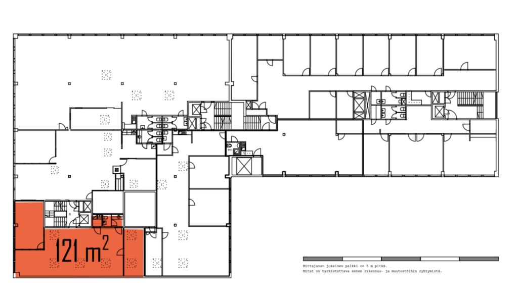 Tämä avara 121 m² toimisto-/showroomtila sijaitsee kiinteistön 5. kerroksessa. Tilassa on avotilan lisäksi kaksi huonetta, joita voi käyttää toimiston tai varastona. Lisäksi tilaan kuuluvat omat keittiö- ja wc-tilat. Kattoikkunat tuovat tilaan valoa.