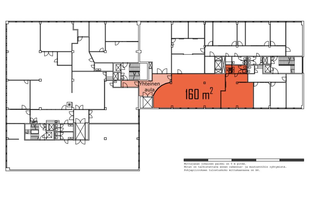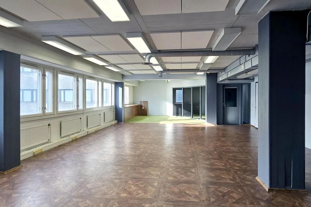 Tämä siisti 160 m² toimisto-/näyttelytila sijaitsee kiinteistön 3. kerroksessa. Avotilan lisäksi tilaan kuuluu huoneita, jossa yhdessä on kaareva lasiseinä. Toimistossa on omat keittiö- ja wc-tilat. Lattia on laminaattia.