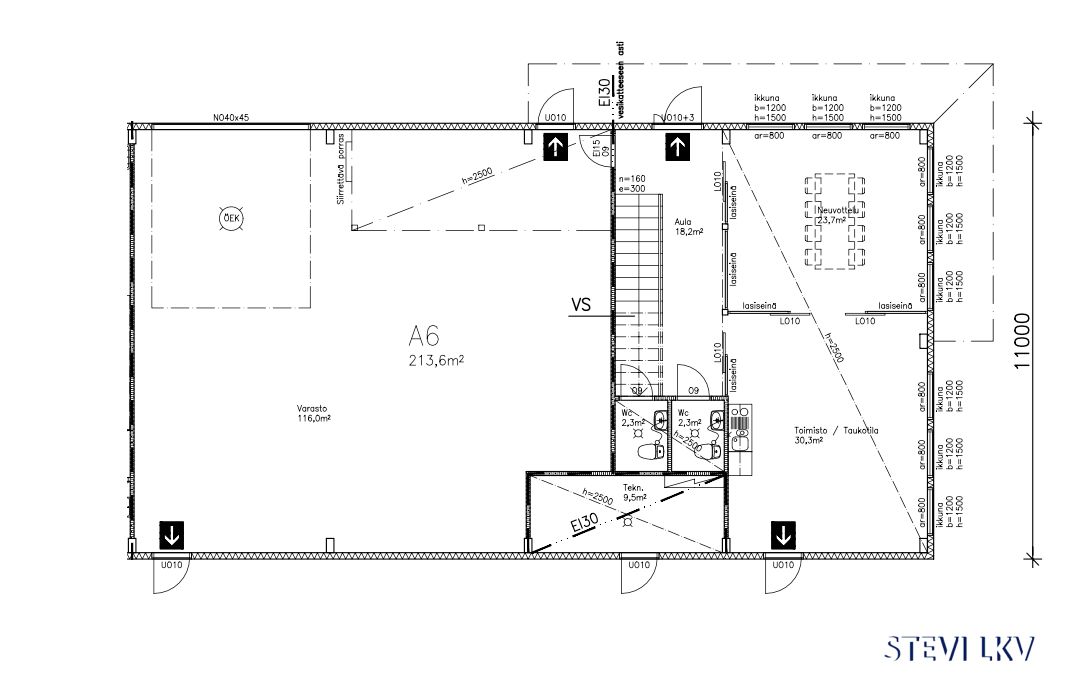 1x iso nosto-ovi (4m leveä & 4,5m korkea) ja lisäksi käyntiovet tiloihin.
