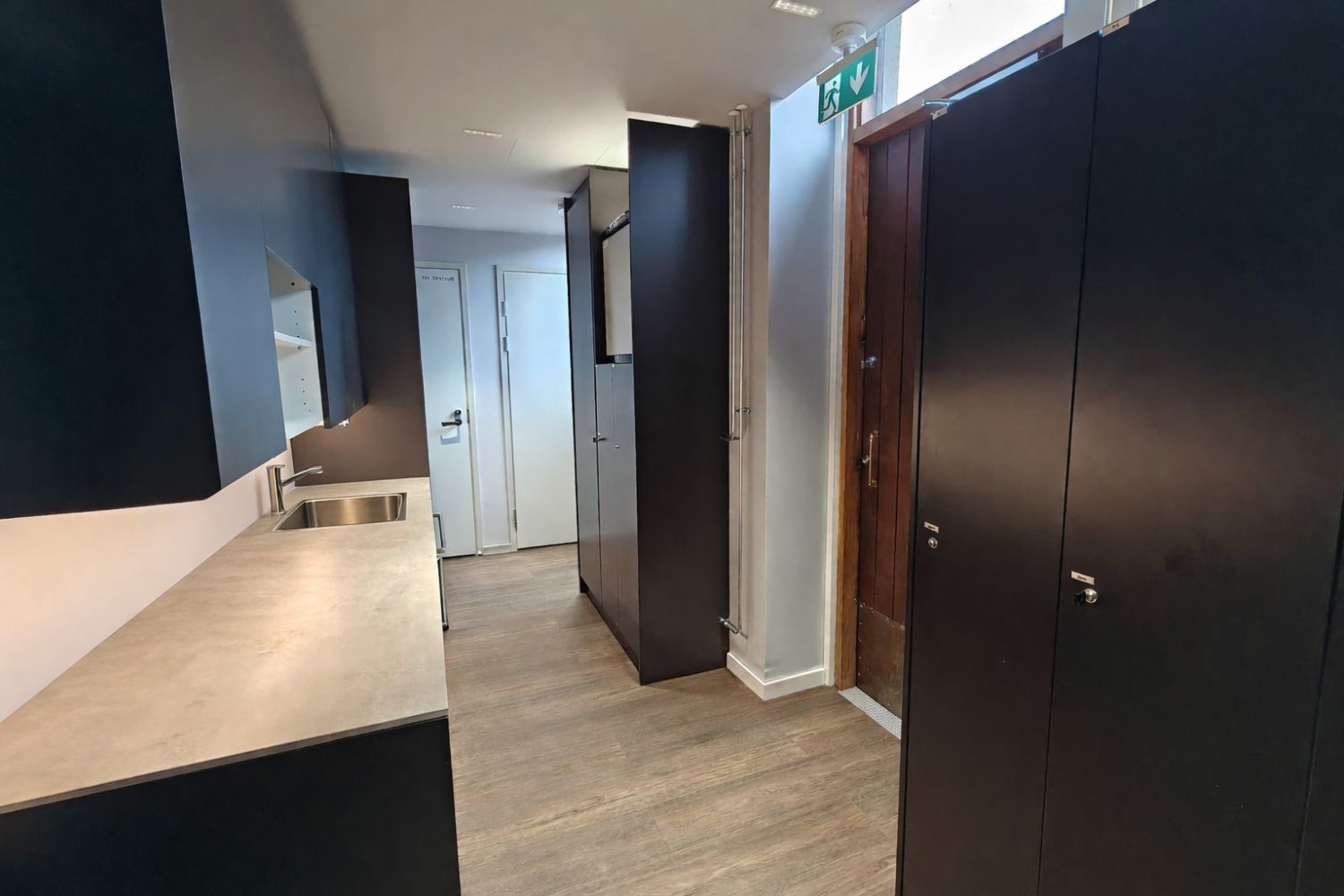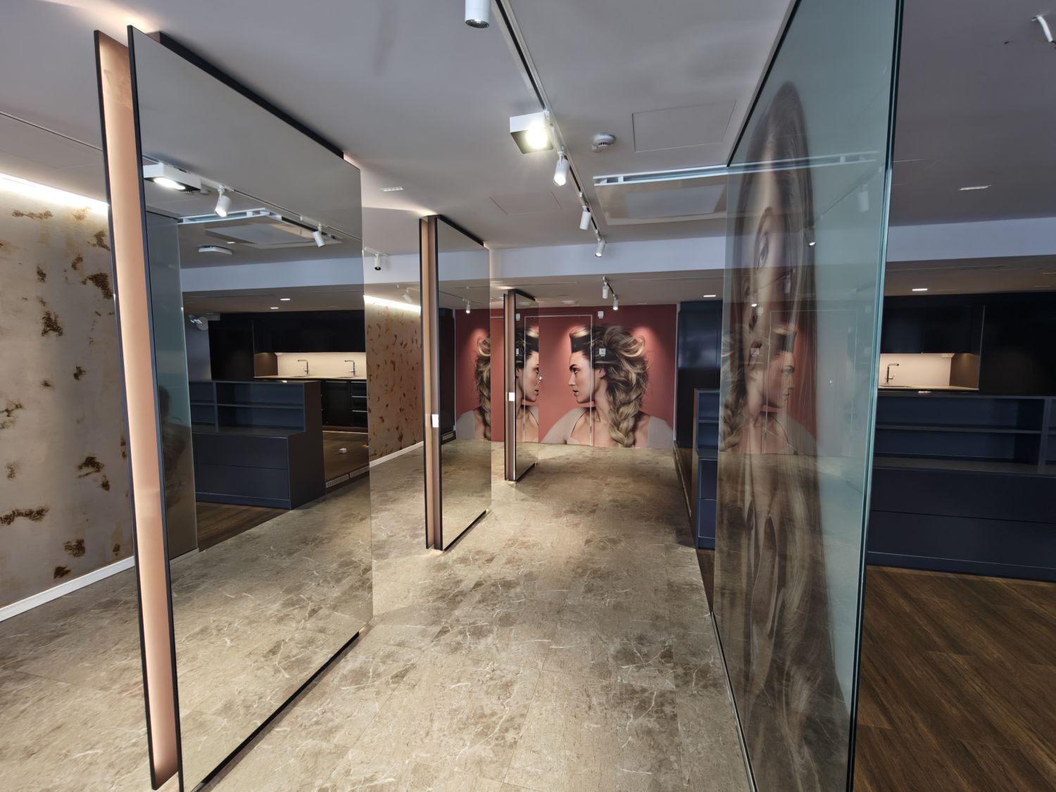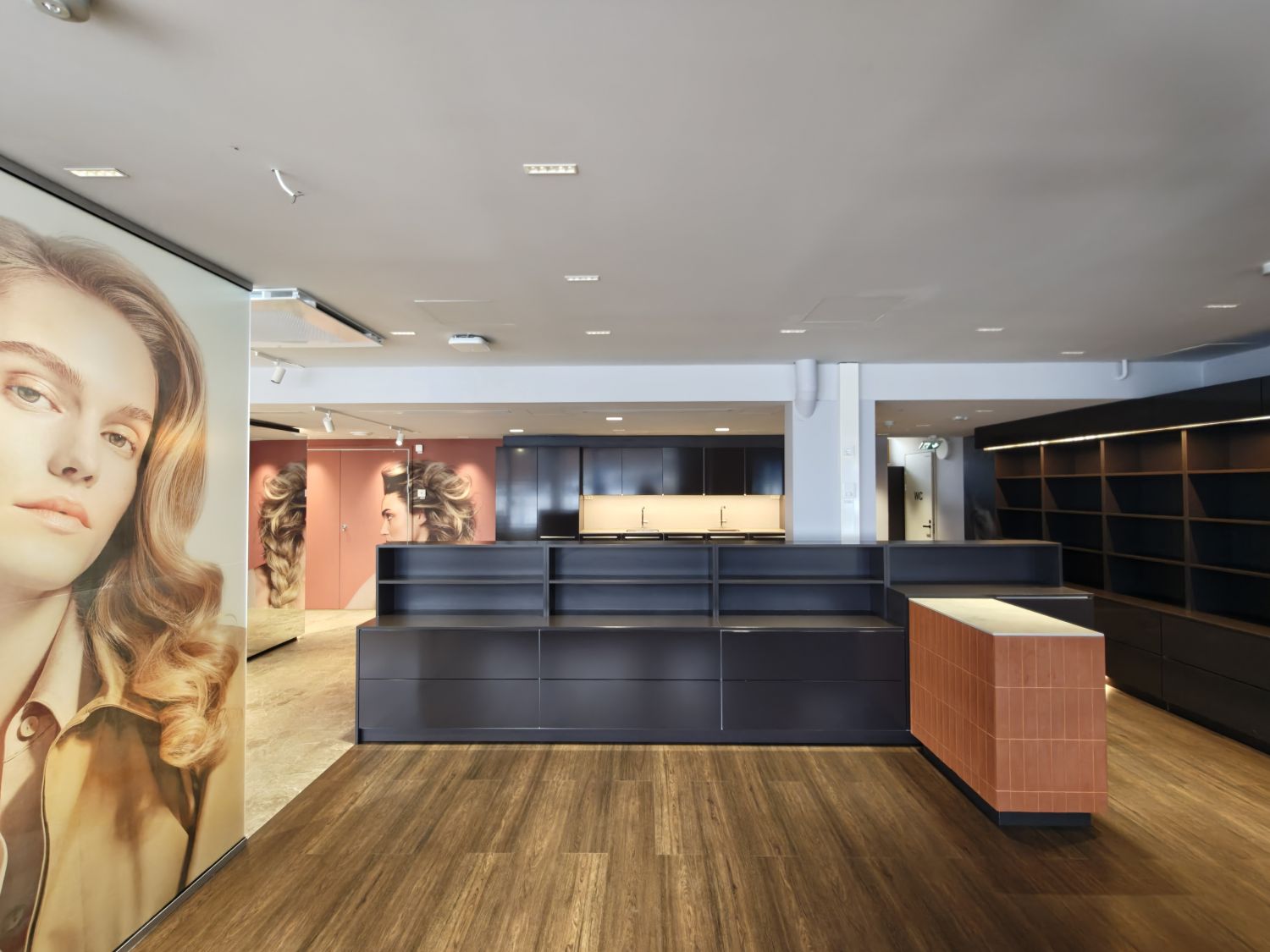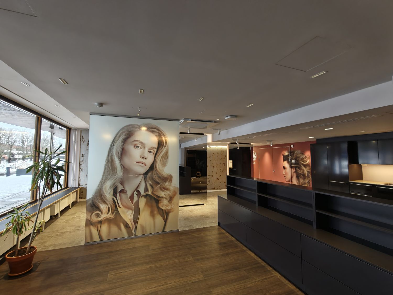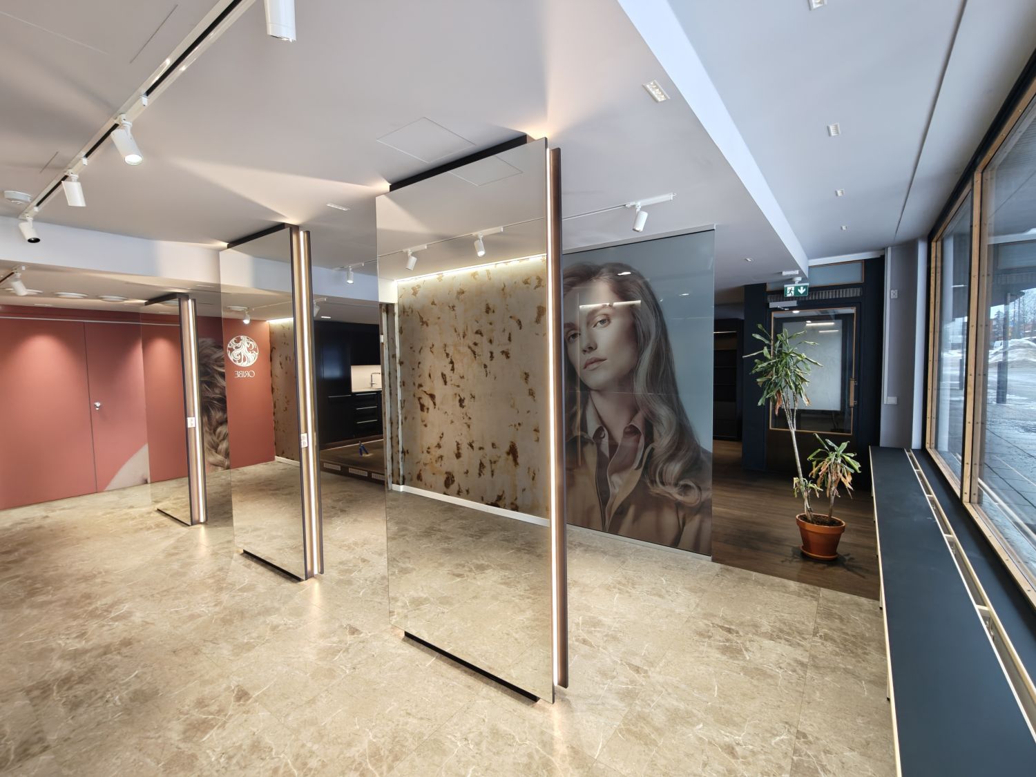 Tila on toiminut parturi-kampaamona, valmiudet kolmelle hiustenpesupisteelle sekä runsaasti kaappitilaa, tilassa hienot peilit ja suuret ikkunat.