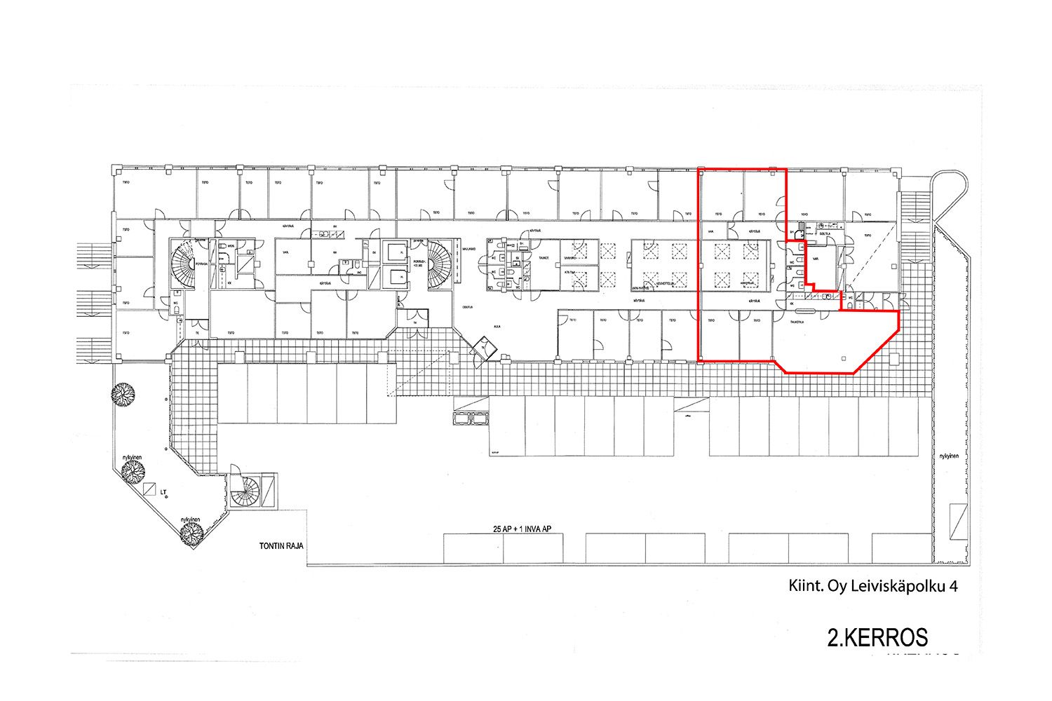 Tila sijaitsee ison toimistorakennuksen pihasiivessä ja on pinta-alaltaan 176 m². Huoneisto on rakennuksen ensimmäisessä kerroksessa ja sisäänkäynti Leiviskäpolun puolelta. Avoin atriumtyyppinen sisääntulo, josta isot ikkunat sisäpihan suuntaan. Huoneistossa lisäksi 4 erillistä toimistohuonetta, iso neuvottelu-/kokoustila, erillinen keittiö ja kaksi WC sekä siivouskomero. Siistit pinnat ja hyväkuntoinen tila.