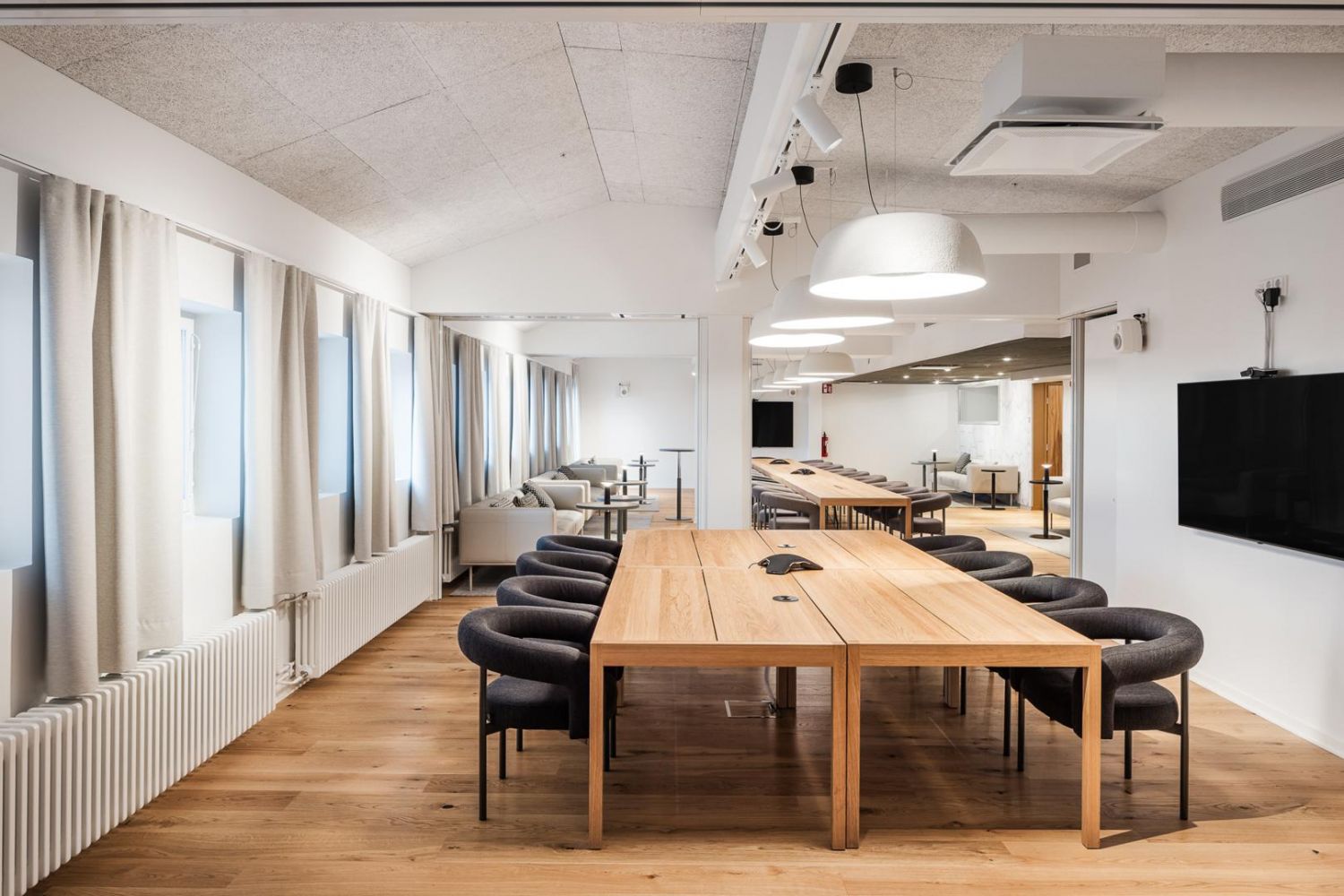Tilassa on viihtyisä working cafe lounge, joka kutsuu rentoon työskentelyyn ja kohtaamisiin. Kolme kompaktia neuvottelutilaa tukevat tehokasta tiimityötä ja asiakastapaamisia, kun taas avotyöalue ja kaksi erillistä työhuonetta tarjoavat joustavuutta erilaisiin työskentelytarpeisiin. Kolme wc-tilaa sekä varasto- ja kopiointitila viimeistelevät kokonaisuuden, joka on suunniteltu nykyaikaisen työyhteisön tarpeisiin.
