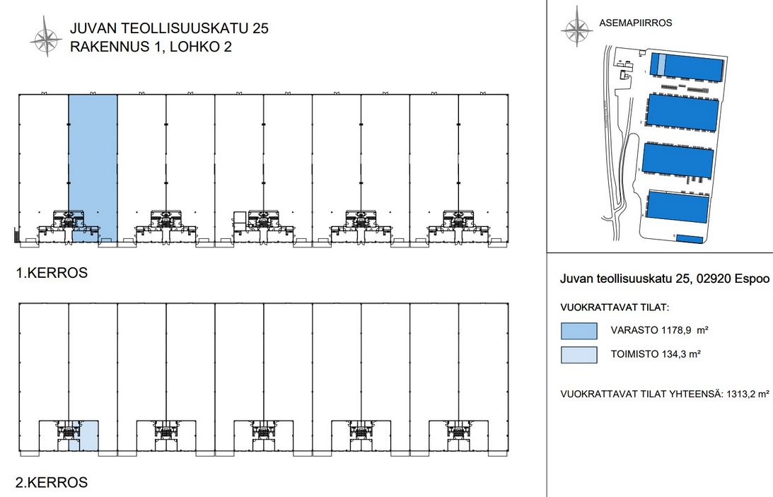 Rakennus 1, lohko 2. Varasto n. 1178,9 m2, toimisto 2.krs n. 134,3 m2. Nykyajan vaatimukset täyttävää logistiikka- / tuotantotilaa, vapaa korkeus n. 6 m. Iso nosto-ovi (4m x 4.51 m) maantasossa, takaovi lastaustasossa. Lattiakantavuus n. 3 000 kg/m2, pistekuormakestävyys 5 000 kg/m2. Tilassa hiekanerotuskaivo. Ohessa havainnollistavia kuvia tiloista.