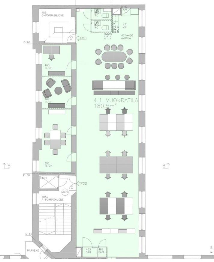 Käytännöllinen toimistotila rakennuksen rauhallisessa F-portaassa. Tilassa on avokonttoria sekä toimistohuoneita. Avokonttorin päädystä löytyvät oma minikeittiö sekä wc-tilat. Tämä tila on mahdollista yhdistää myös ylemmän kerroksen tilaan luoden 348,5 m2 kokonaisuuden. Käynti sisäpihan kautta.