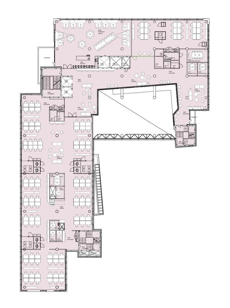 Nyt vuokrattavissa on neljännen kerroksen moderni toimistotila. Tila soveltuu sekä toimisto- että koulutuskäyttöön, ja sitä on mahdollista muokata käyttäjän tarpeiden mukaan. Tarvittaessa tila voidaan yhdistää sisäportailla viidennen kerroksen 714 m² tilaan.