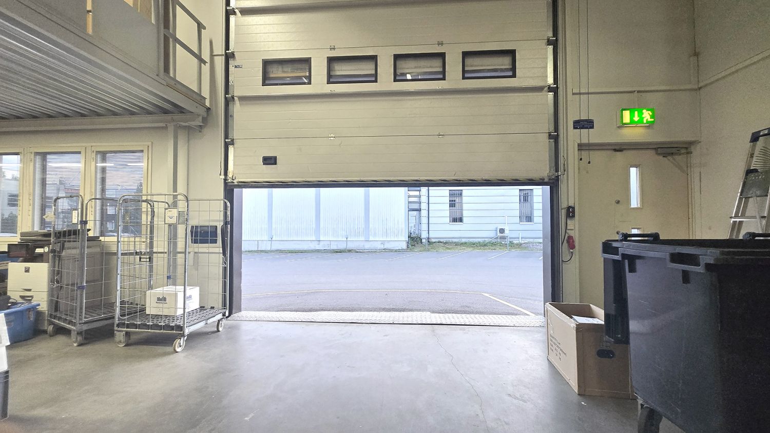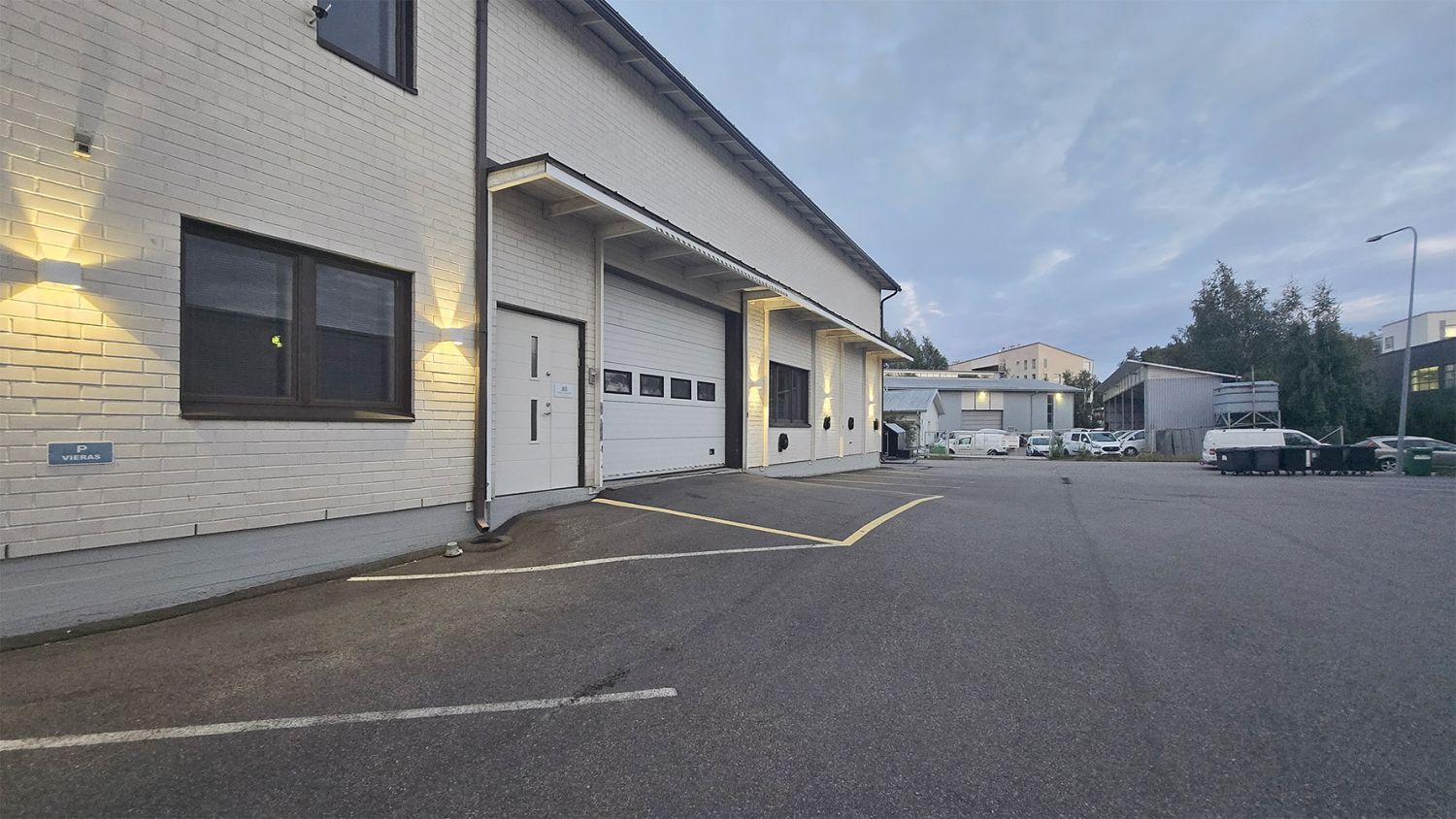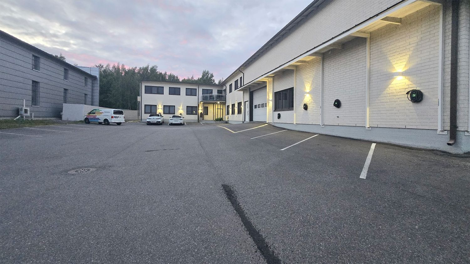 Asfaltoitu piha-alue, missä runsaasti parkkipaikkoja ja sähköautojen latauspisteitä. Varaston nosto-ovelle pääsee myös isolla kuorma-autolla.