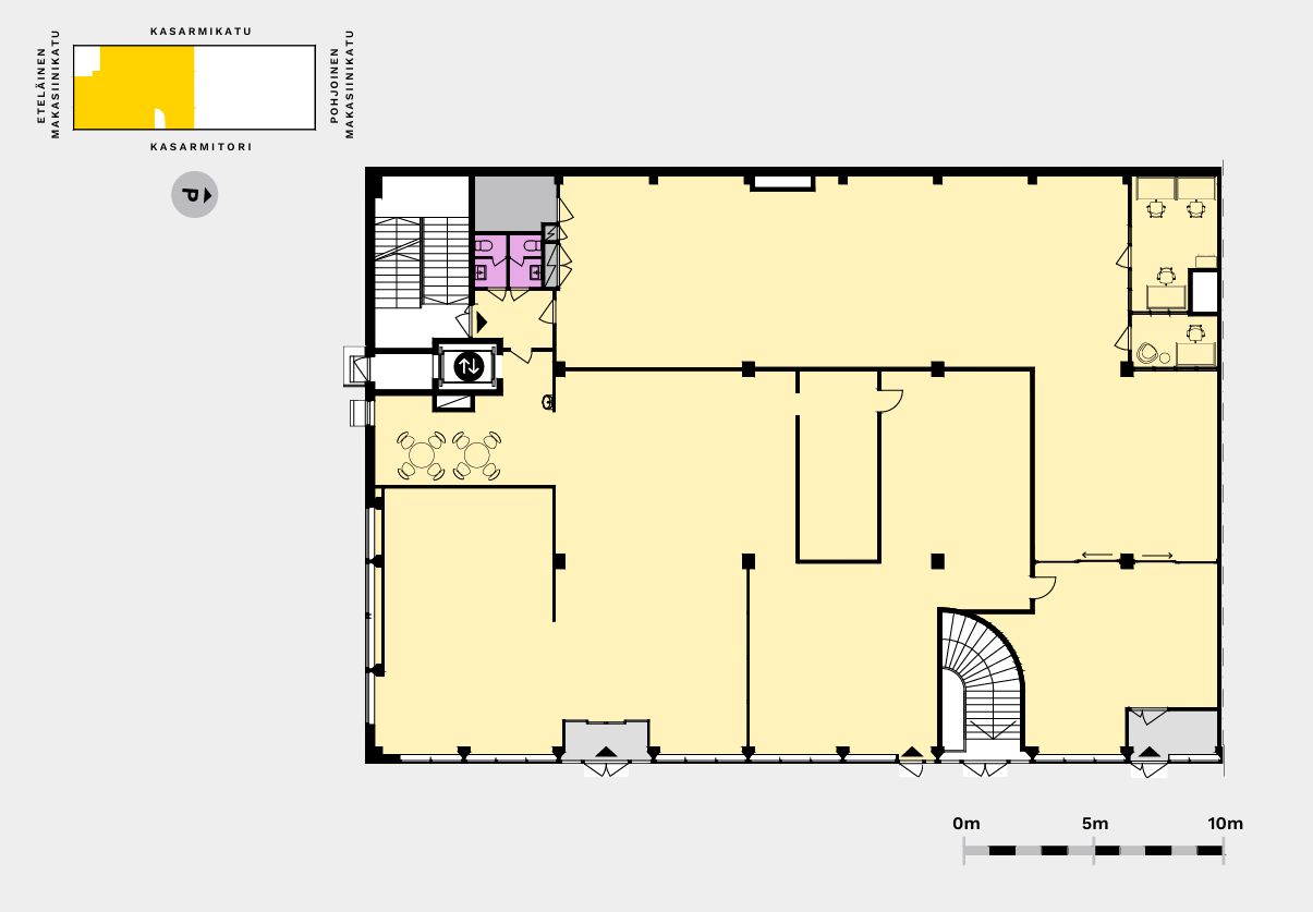 Tämä näyttävä liiketilakokonaisuus avautuu suoraan Kasarmitorille, tarjoten erinomaisen näkyvyyden ja houkuttelevan sijainnin asiakasvirtojen kannalta. Tilat muodostavat yhteensä noin 670 m² kokonaisuuden, joka on mahdollista jakaa kahteen erilliseen osaan: kulmatilaan noin 210 m² ja suurempaan tilaan noin 460 m². Jaetussa ratkaisussa tiloilla on yhteiskäytössä olevat wc-tilat, mikä tuo joustavuutta ja kustannustehokkuutta.