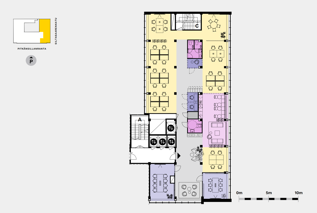 Pitkänsillanranta 3 tarjoaa ainutlaatuisen yhdistelmän rauhoittavaa merimaisemaa ja urbaania sykettä. Toimitilat sijaitsevat veden äärellä, ja ikkunoista avautuvat upeat näkymät Siltavuorenrannan ja Eläintarhanlahden suuntaan. Rakennuksesta pääsee suoraan rantapromenadille, joka kutsuu virkistäytymään työpäivän lomassa tai sen päätteeksi. Hakaniemen historiallinen ja eläväinen ympäristö tekee kohteesta houkuttelevan niin työntekijöille kuin asiakkaillekin.