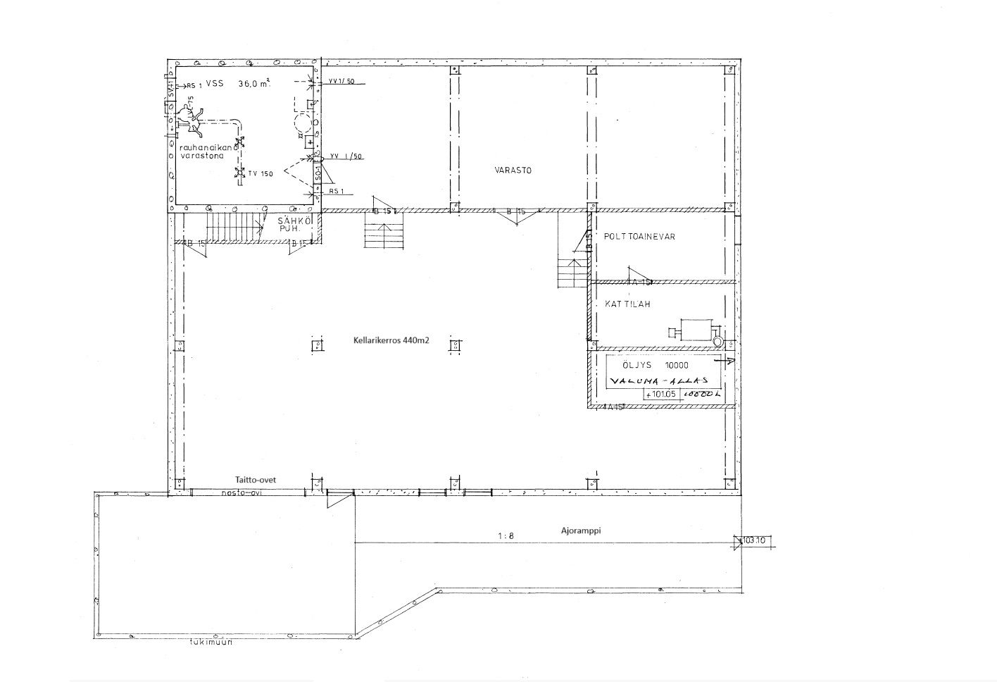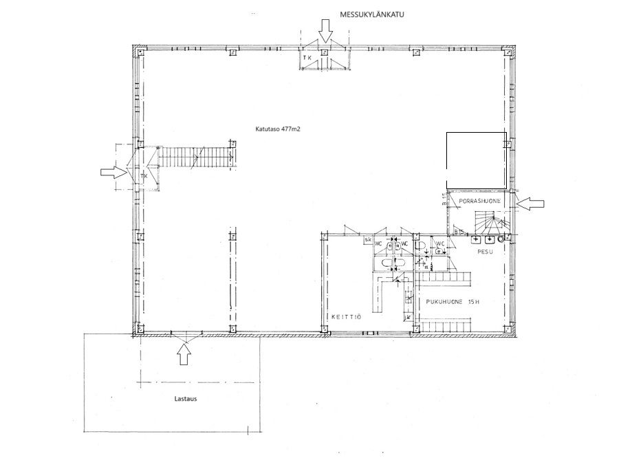 -Katutason n.440 m2 tila koostuu avarasta tilasta, keittiö- ja wc tiloista sekä erillisestä toimistohuoneesta. Lisäksi erillisen rapun yhteydessä on pukuhuonetilat.