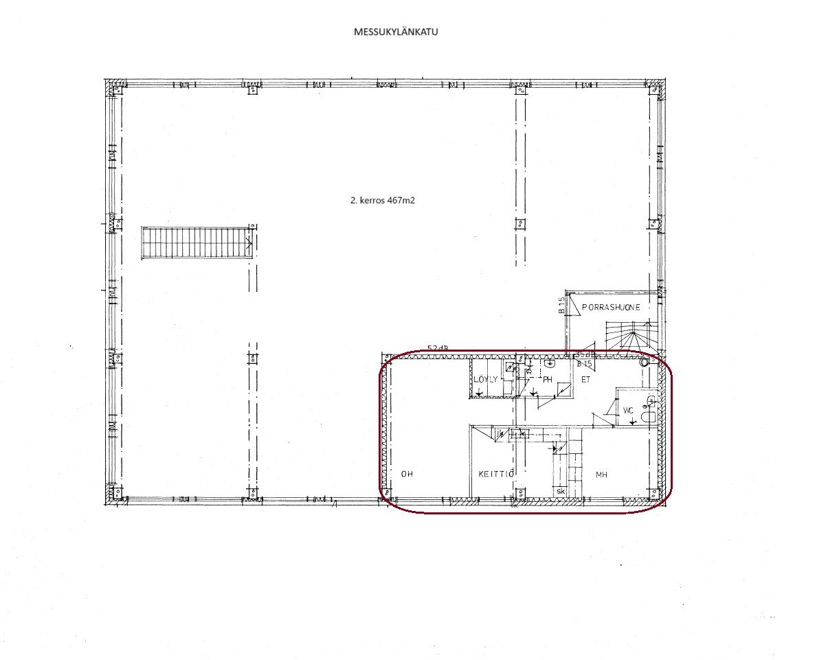 -2. kerroksen n. 440 m2 tila koostuu avarasta tilasta, kevyin väliseinin eritetuista työ-/toimistotiloista. Erillisen rapun kautta on kulku asuinhuoneistoon, joka on ollut toimistokäytössä. Sen yhteydessä sijaitsevat tämän kerroksen sosiaalitilat.
