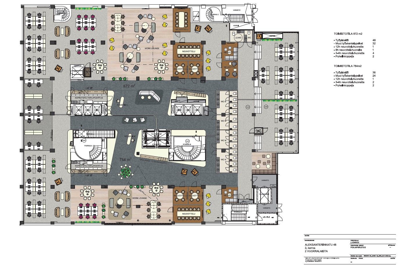 Upea 2 kerroksen 1656m2 suuruinen toimistotila, josta lattiasta kattoon ulottuvat ikkunat Aleksanterinkadulle ja sisäpihalle. Tila voidaan jakaa kahdelle käyttäjälle ja tilat toteutetaan täydellisesti tulevan vuokralaisen yksilöllisten toiveiden mukaan. Ohessa esimerkkipohjakuvia siitä, millä tavalla tiloja voidaan jakaa ja suunnitella.