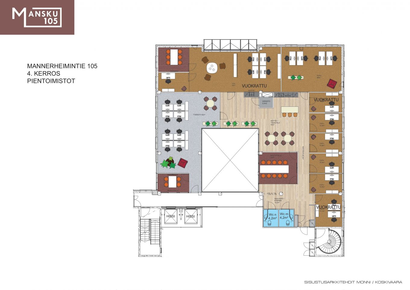 Mansku 105 on moderni toimistokiinteistö näkyvällä ja helposti saavutettavalla paikalla Helsingin Ruskeasuolla. Kohteen vahvuuksia ovat nykyaikaiset ja muuntojoustavat tilaratkaisut. Tilat ovat avarat ja valoisat sekä juuri remontoidut, eli muuttamaan pääsee vaikka heti.