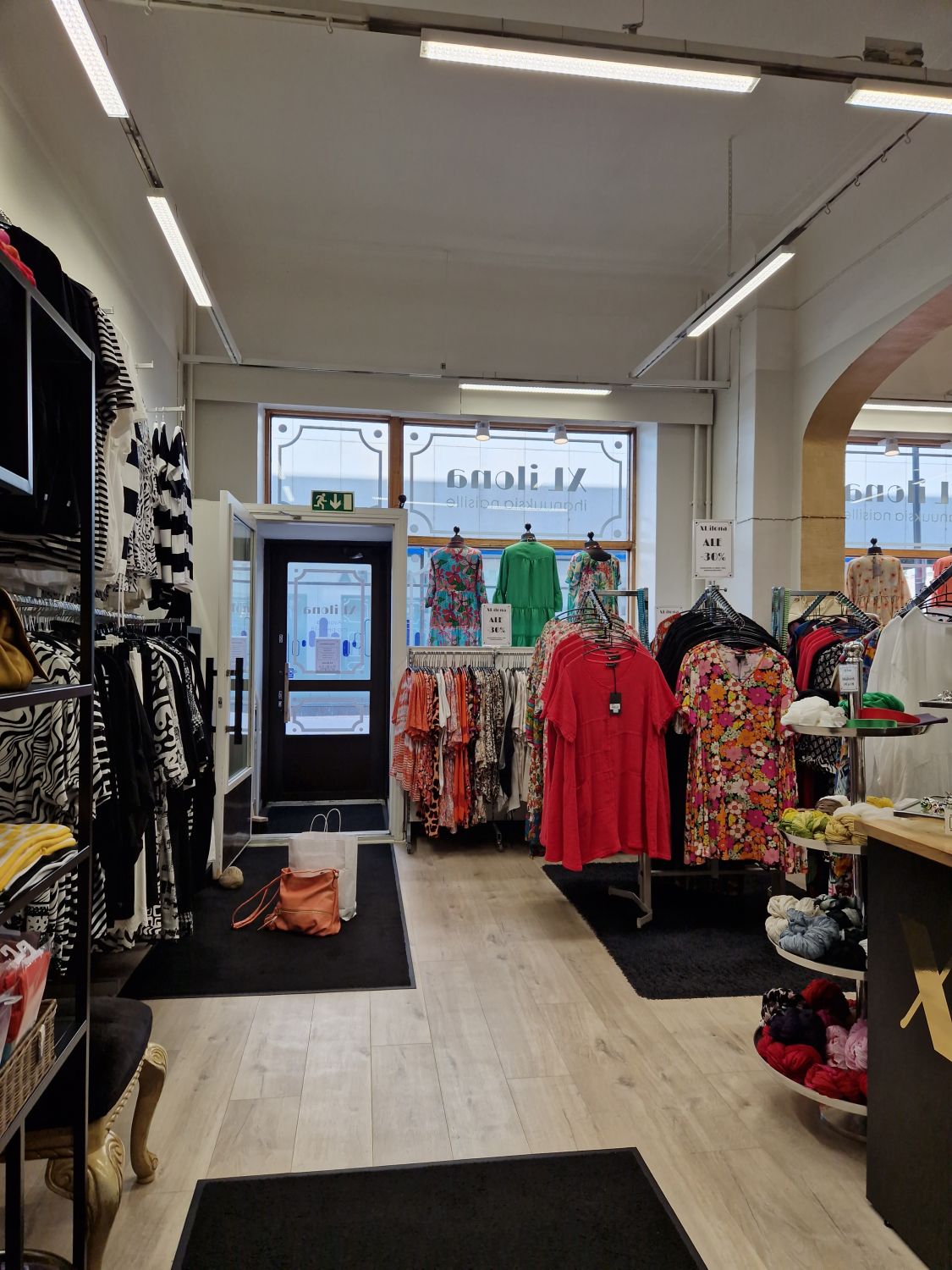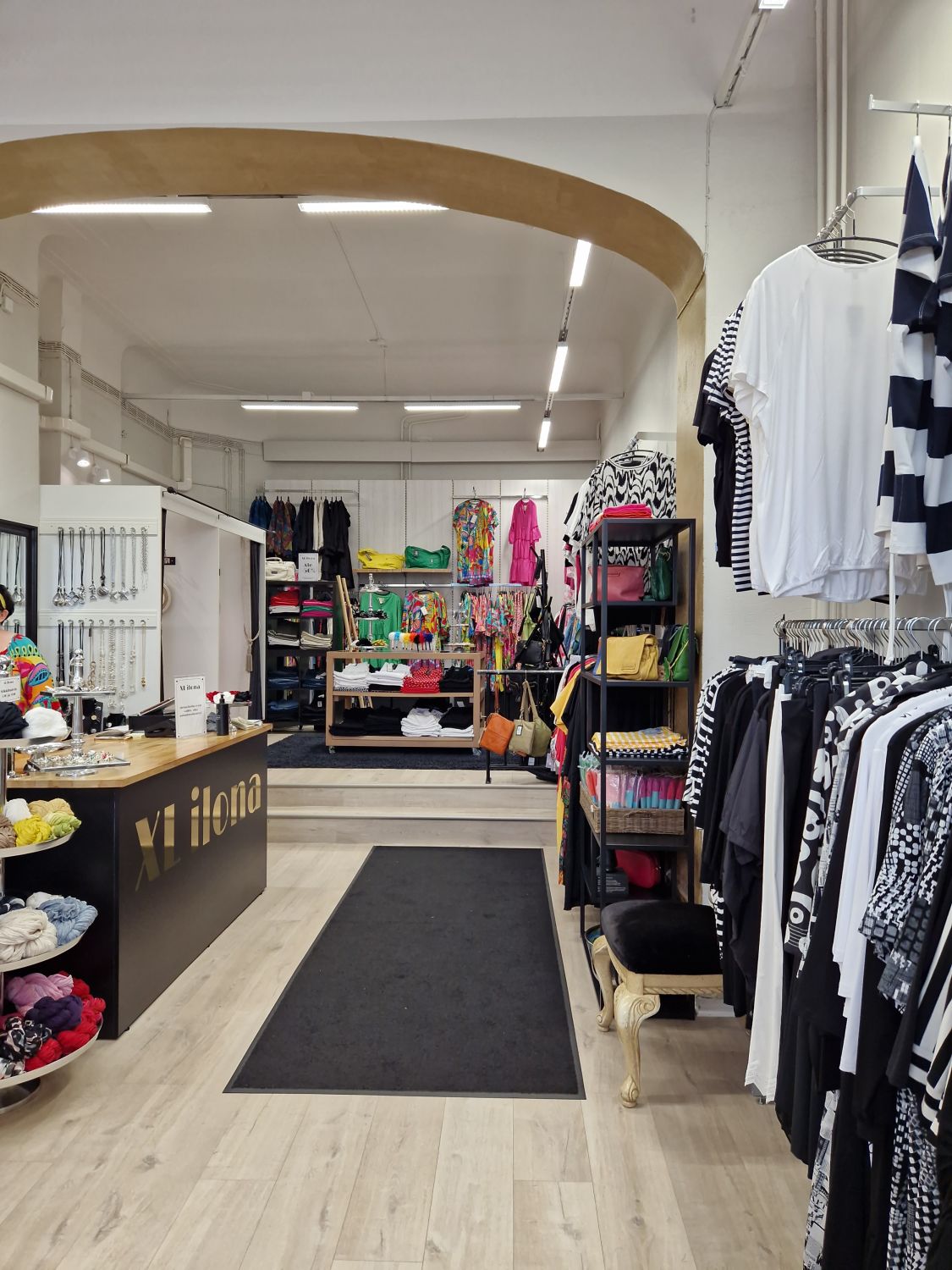 Sisäänkäynti ja isot näyteikkunat ovat Pakkahuoneenkadun puolella.