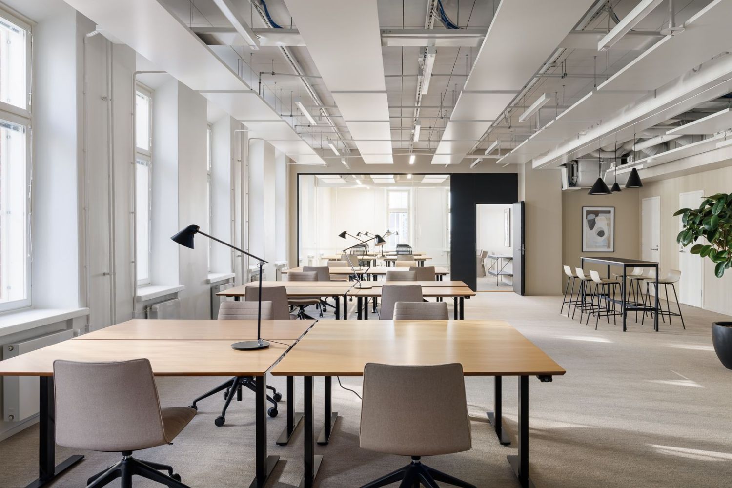 Tilassa on avotilaa, työhuone, neuvotteluhuone, tiimitila sekä keittiö/loungetila.
