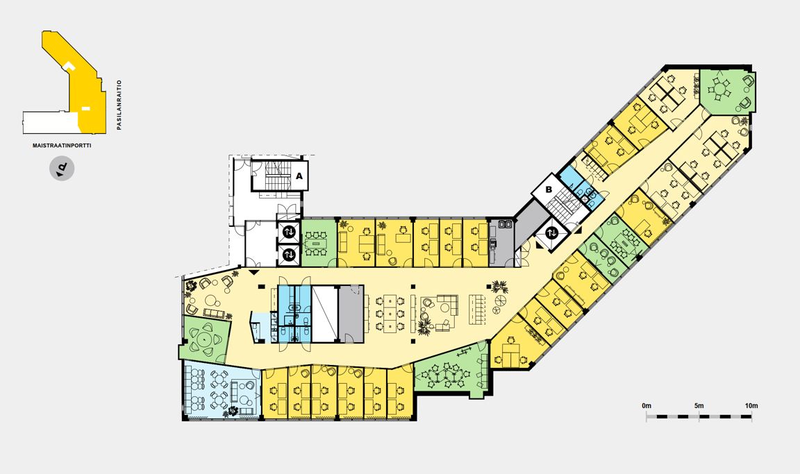 Maistraatinportti 4 tarjoaa yrityksellesi kustannustehokkaan ja muuntautuvan toimitilan Länsi-Pasilan keskeisellä sijainnilla. Täällä yhdistyvät erinomainen saavutettavuus, toimivat tilaratkaisut ja monipuolinen palveluympäristö: kaikki, mitä moderni työympäristö vaatii. Valoisat avo-, huone- ja monitoimitilat ovat helposti muunneltavissa yrityksesi tarpeisiin ja visuaaliseen ilmeeseen. Koneellinen ilmanvaihto ja jäähdytetty tuloilma varmistavat miellyttävät työolosuhteet ympäri vuoden.