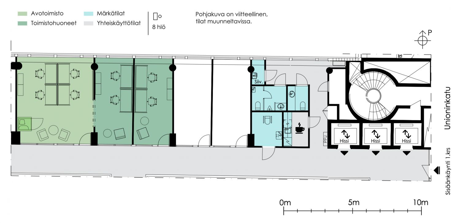 Uudistuneet tilat tarjoavat henkilökunnallenne työhyvinvointia tukevan työympäristön, joka on muokattavissa toiveidenne mukaan noin 200 - 3000 neliön toimistoiksi.