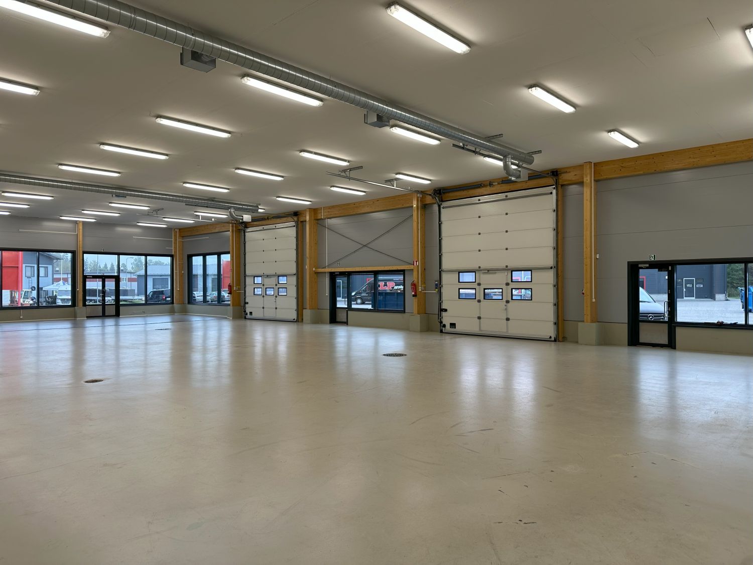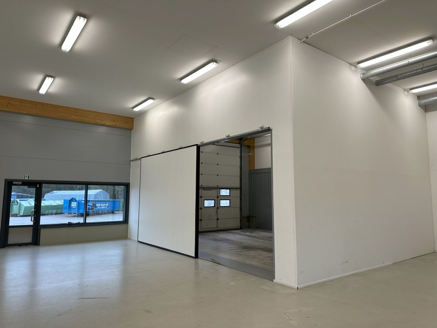 Kolme korkeaa nosto-ovea 4m x 4,5m. Kyseessä päätyhuoneisto ja näin hallin päädyssä on myös hieman pihatilaa. Halli n. 600m2. Lämmitys maalämmöllä vesikiertoisen lattialämmityksen muodossa.
