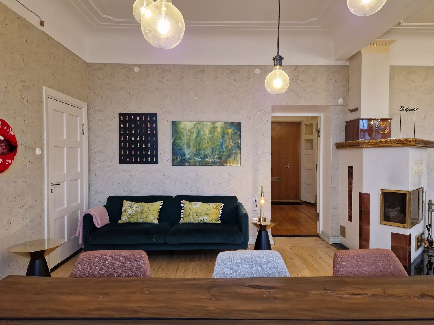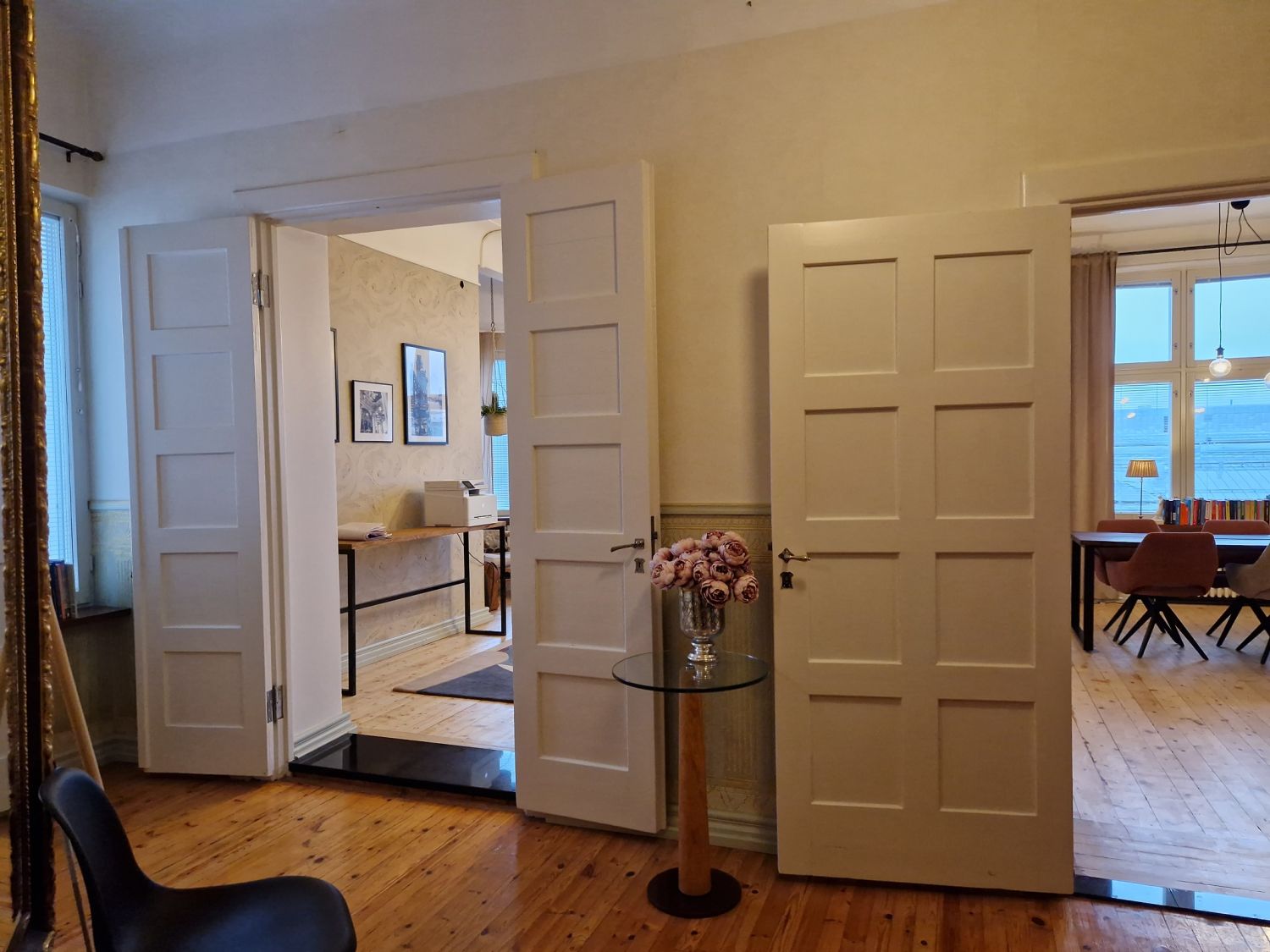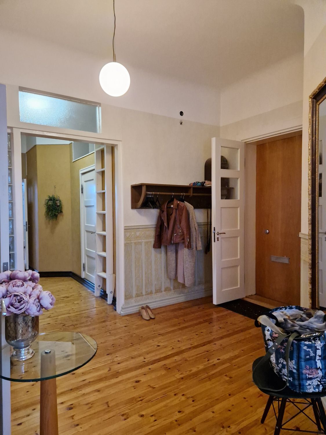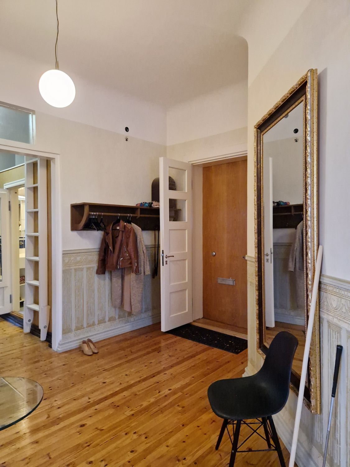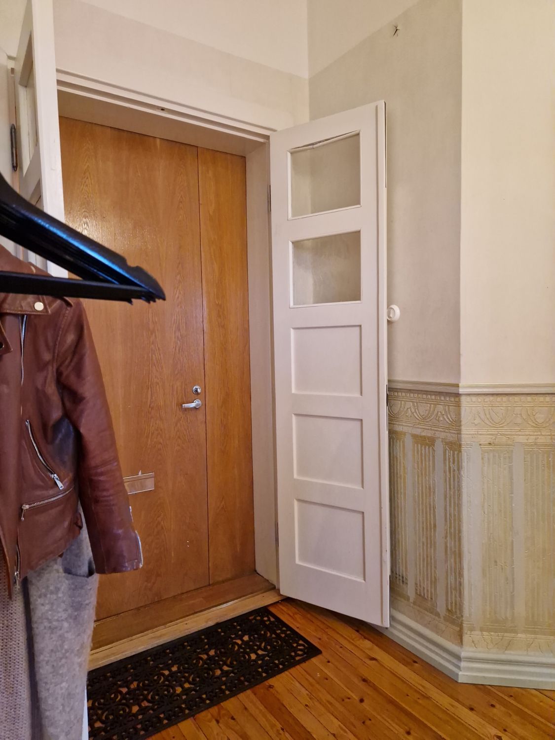 Rauhallinen pihanpuolen huoneisto, korkeat (3,3 m) huoneet, lattiat lakattua lautaa, seinät tapetoitu.