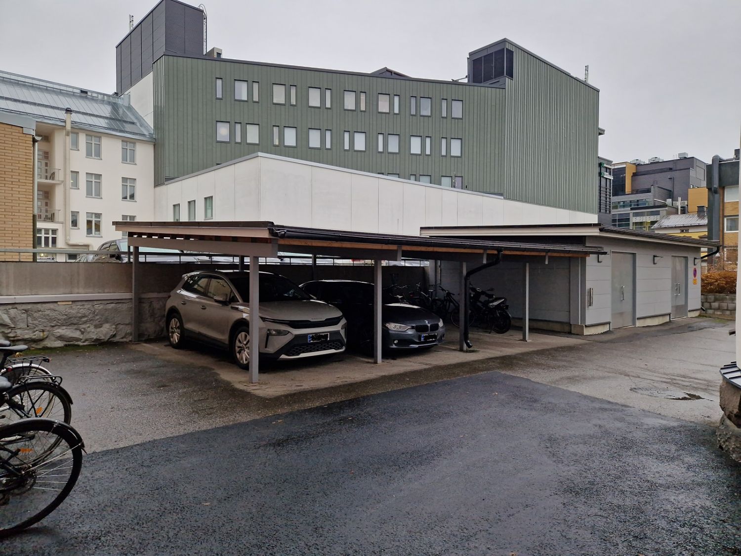Sisäpihalta vuokrattavissa 1 kpl pistokkeellinen autokatospaikka 60e/kk.